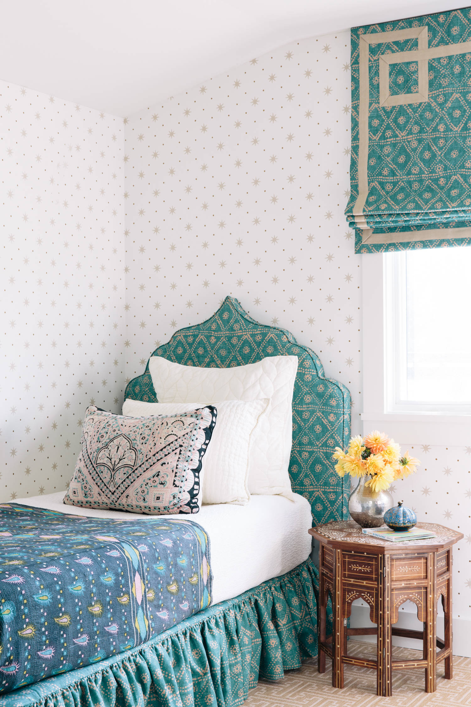 Moran designed the headboard and covered it in a turquoise patterned fabric, also used for the curtains. A vintage Turkish blanket provides bedding.