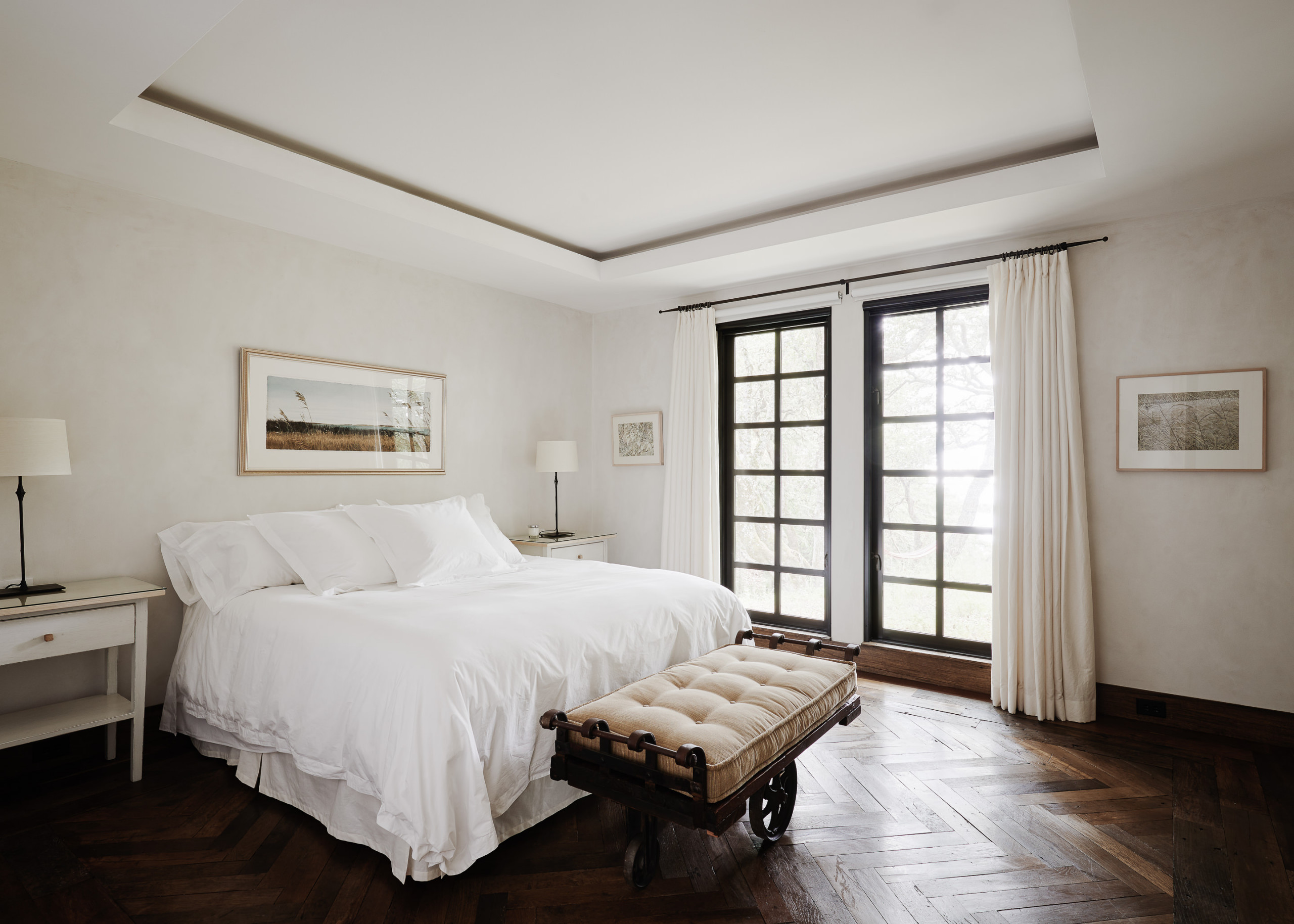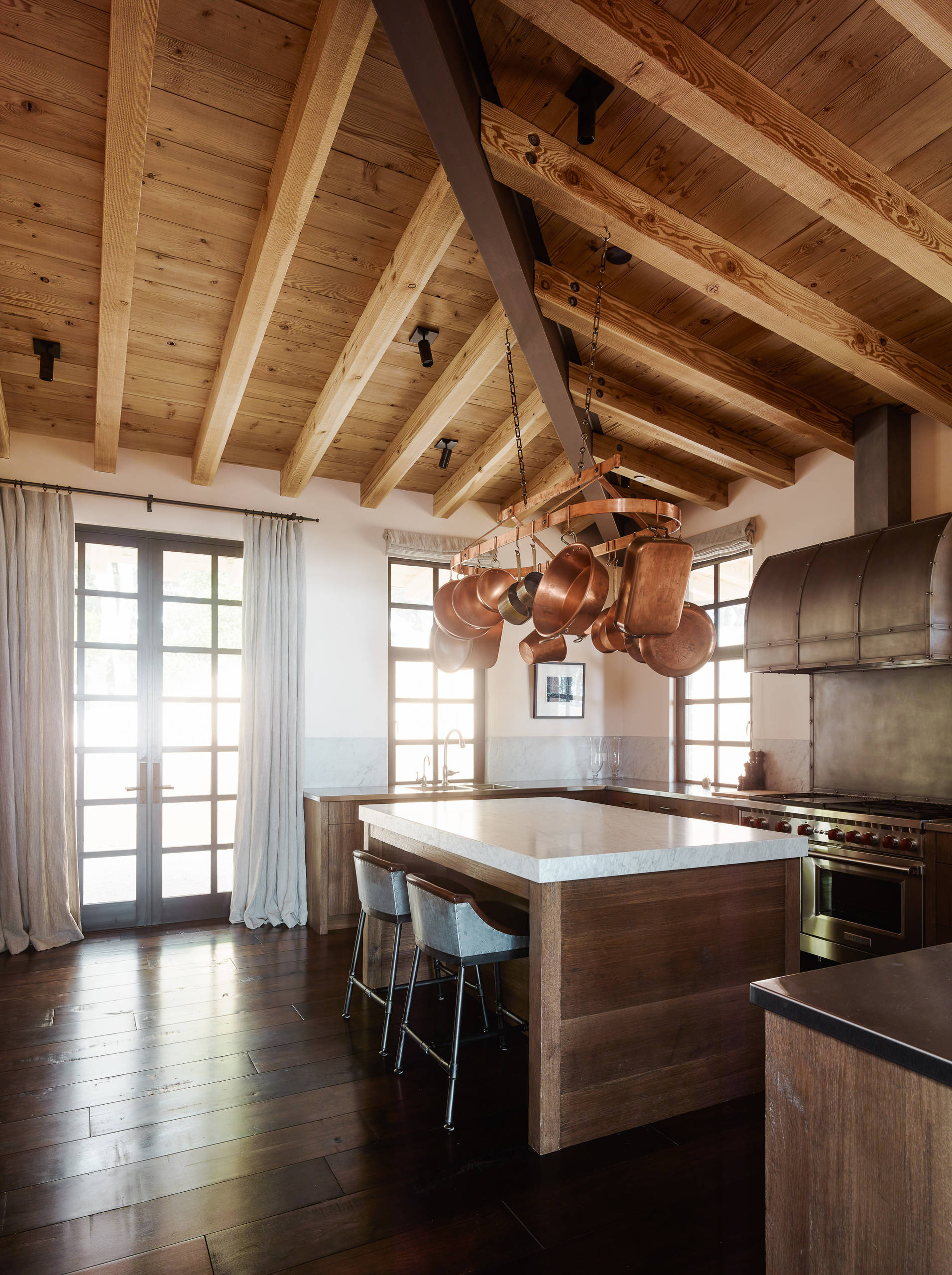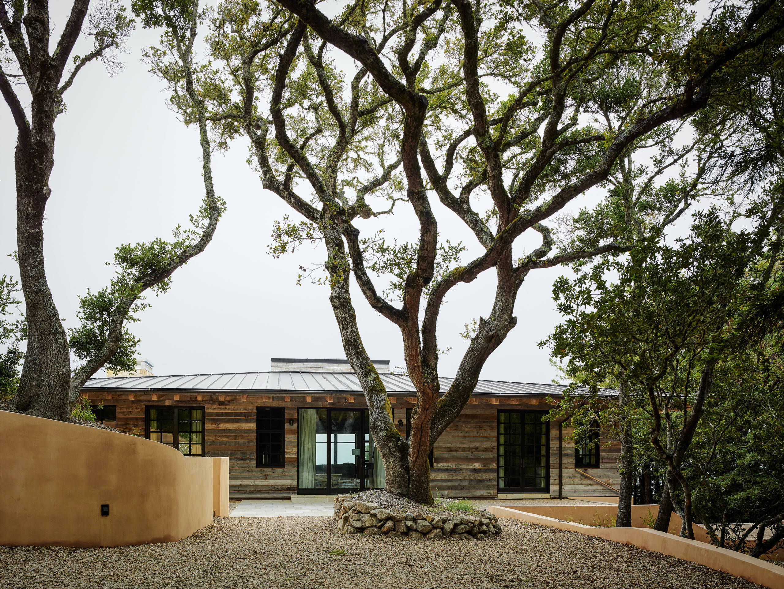 Reclaimed barn siding clads the exterior of the home, creating an almost cabinlike facade and immediately reinforcing that its purpose is to provide repose.