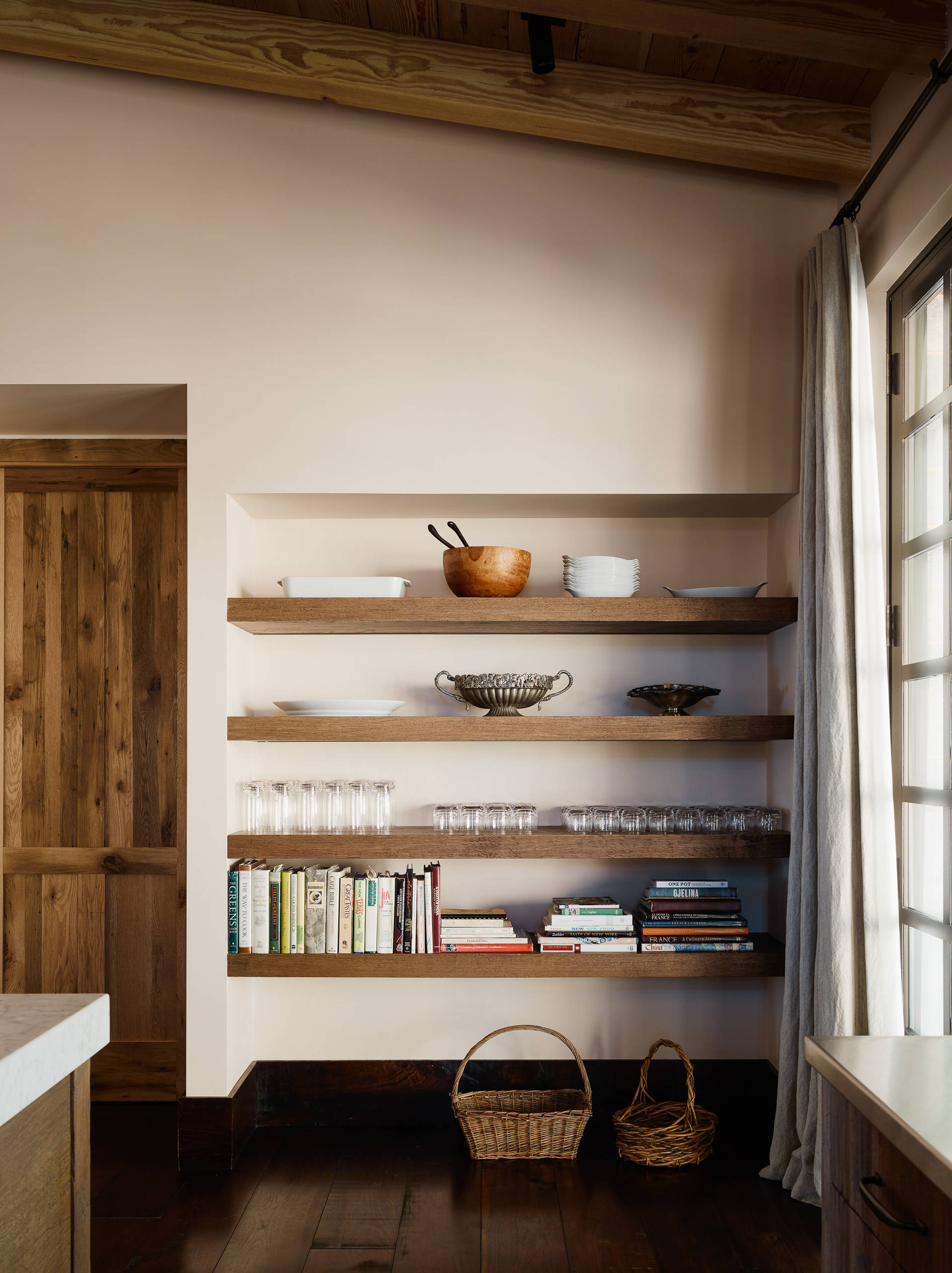 Flooring: distressed wide-plank walnut