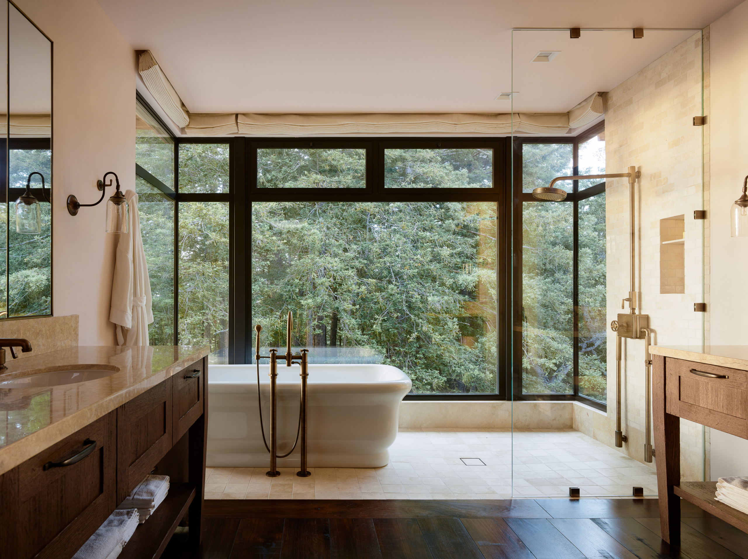 Plumbing fixtures: Henry series in antique brass, Waterworks; bathtub: Empire, Waterworks; custom reclaimed light fixtures: Ohm Light