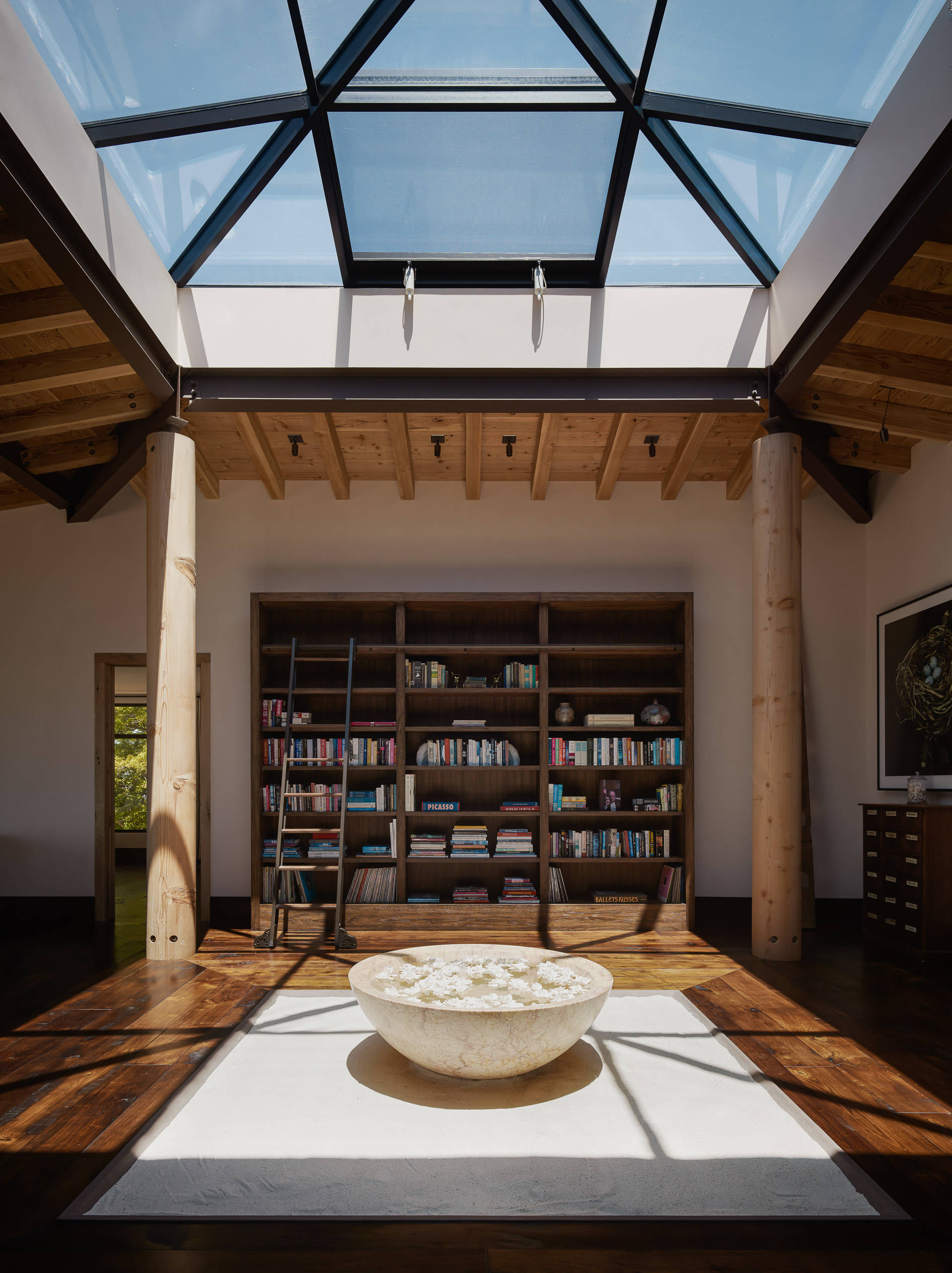 The project was originally built completely off the grid. Today, a connection to the grid exists, but the entire property is primarily serviced by a large solar array, and conservation of natural resources remains very important to the family.