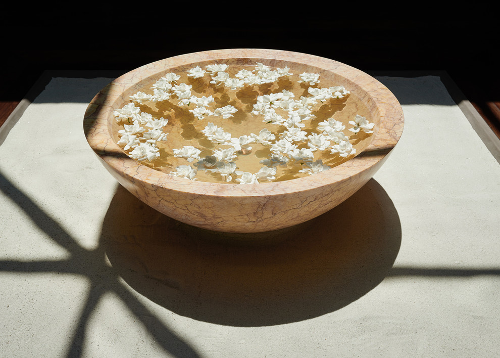Flowers float in a large bowl, carved from a single piece of marble. It sits on the sand as a minimal centerpiece.