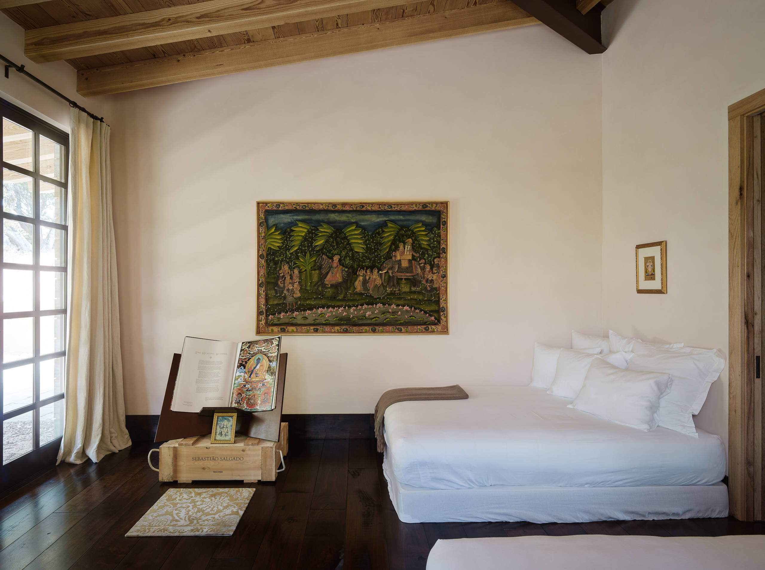 The bedroom in this guest house, in keeping with the rest of the property, remains minimally furnished yet abundant in warmth. Dappled light filters in through the windows, and sweeping views support a constant connection to nature — both as a principle of Sthapatya Veda and as an essential tool in the pursuit of tranquillity.