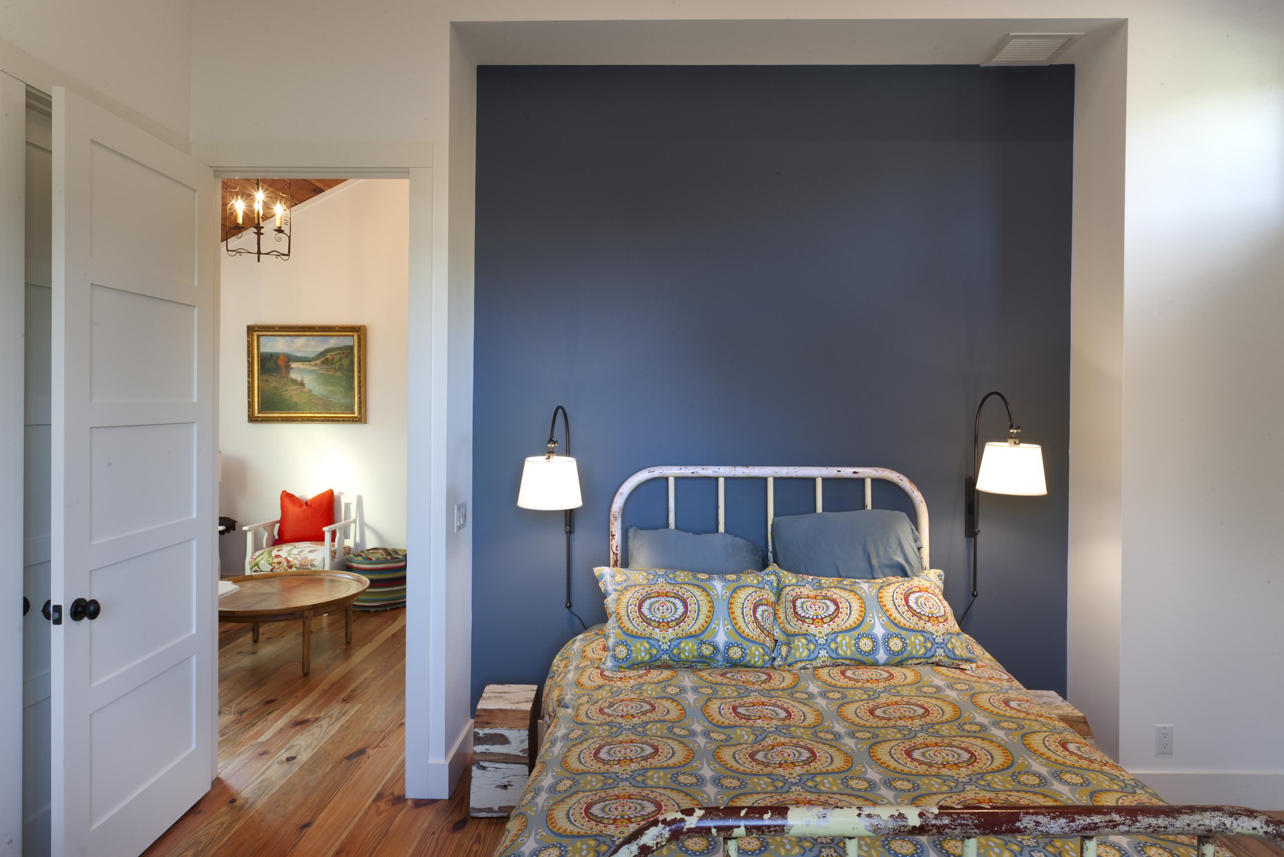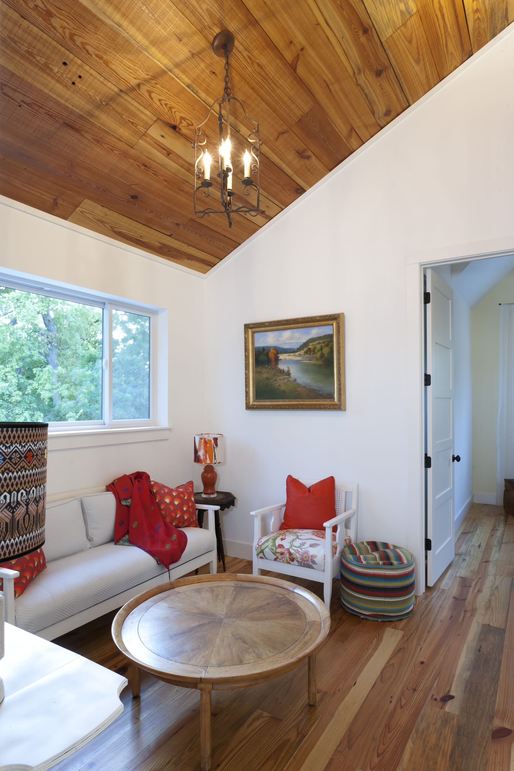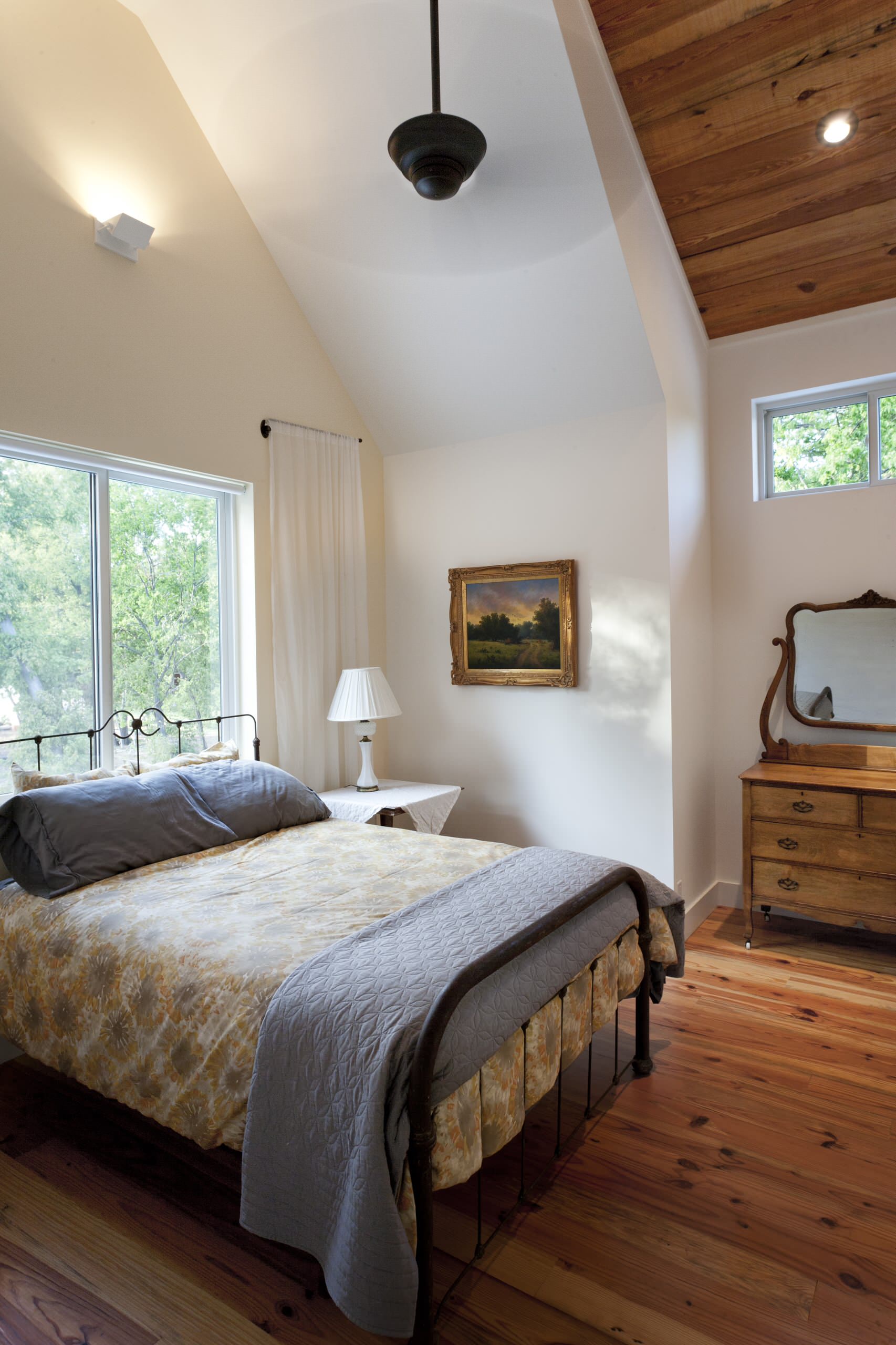 The downstairs master bedroom has a rustic vibe, with reclaimed wood floors and ceilings.