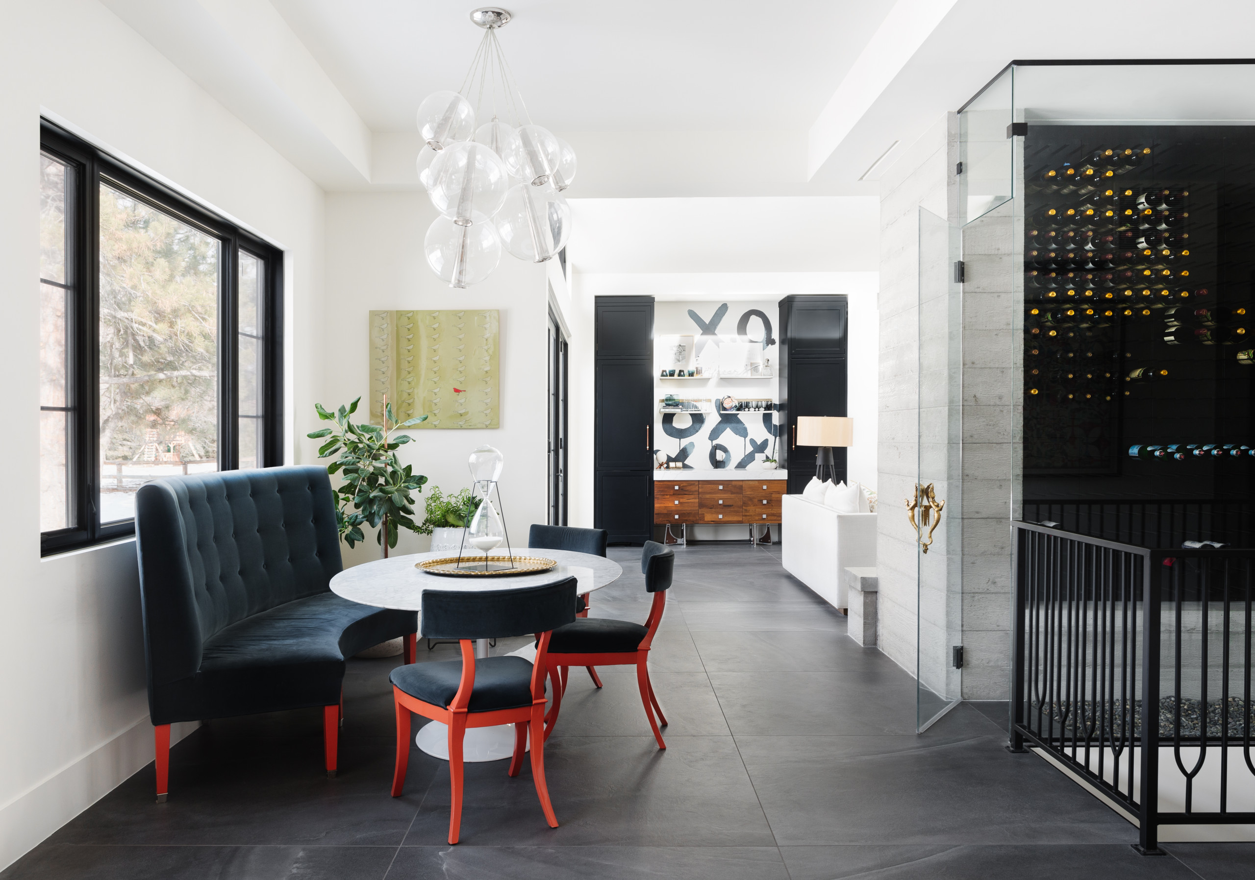 Beyond the fireplace, a bubble-like glass chandelier over the dining table draws people into the next space and toward the next surprise.