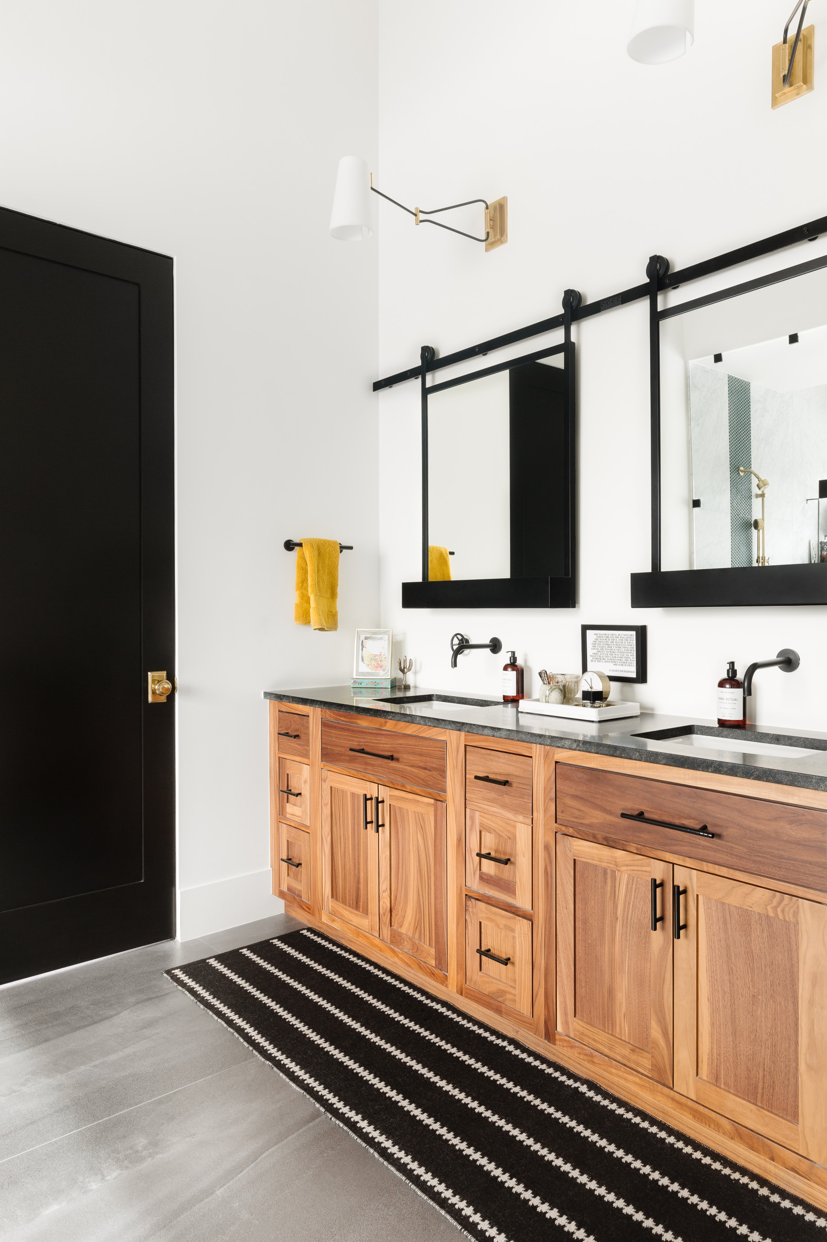 Like the kitchen, the bathroom has a high ceiling that makes it feel larger than it is. The custom vanity is walnut. “It adds a hint of rustic style,” Bride says. Also adding a hint of rustic style are twin mirrors on a barn-door track. Crafted by Oliver, this unexpected custom piece is another cool surprise.