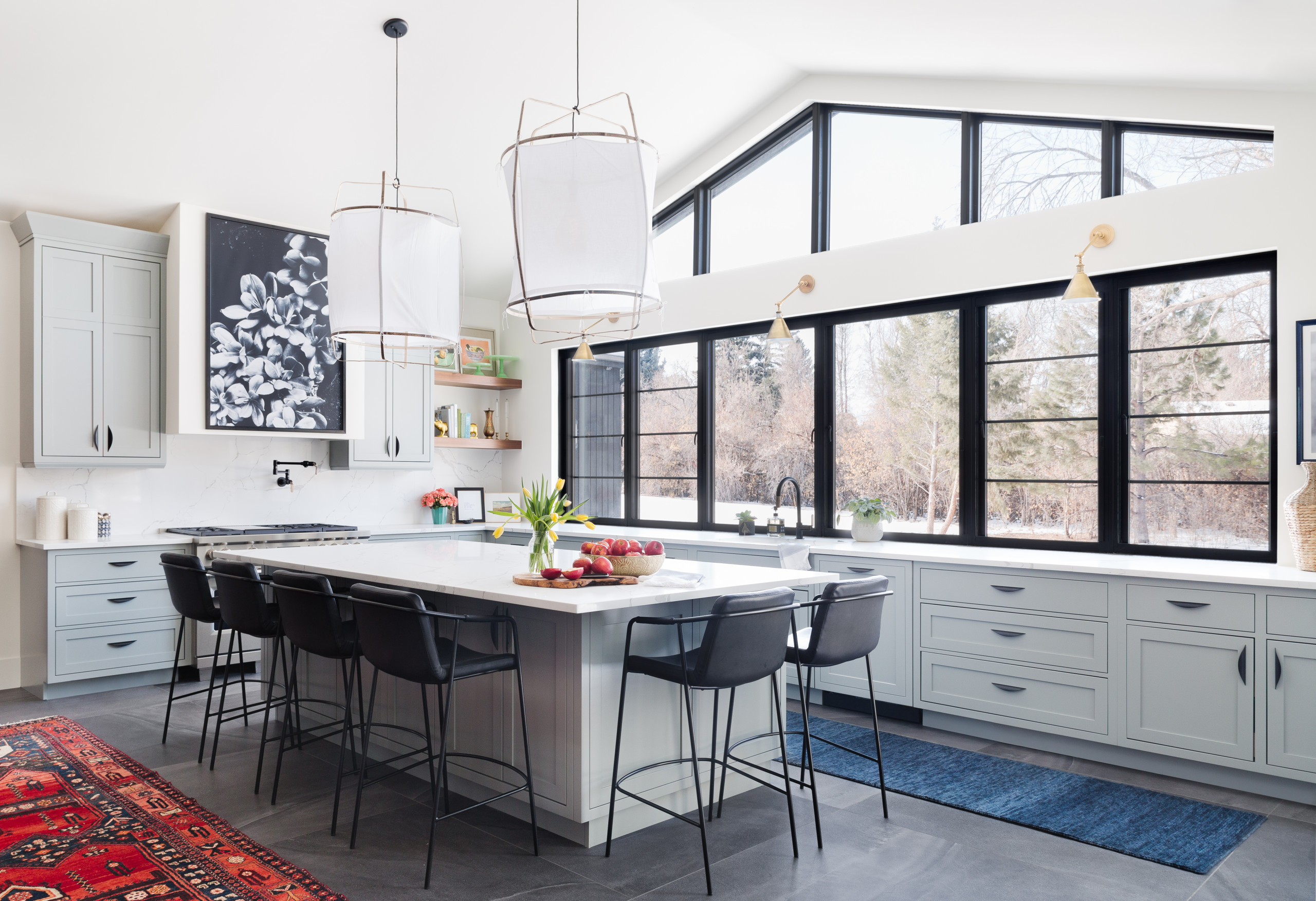 Six seats abut the large island, and oversize pendants that resemble paper lanterns overhead suit the scale of the space.