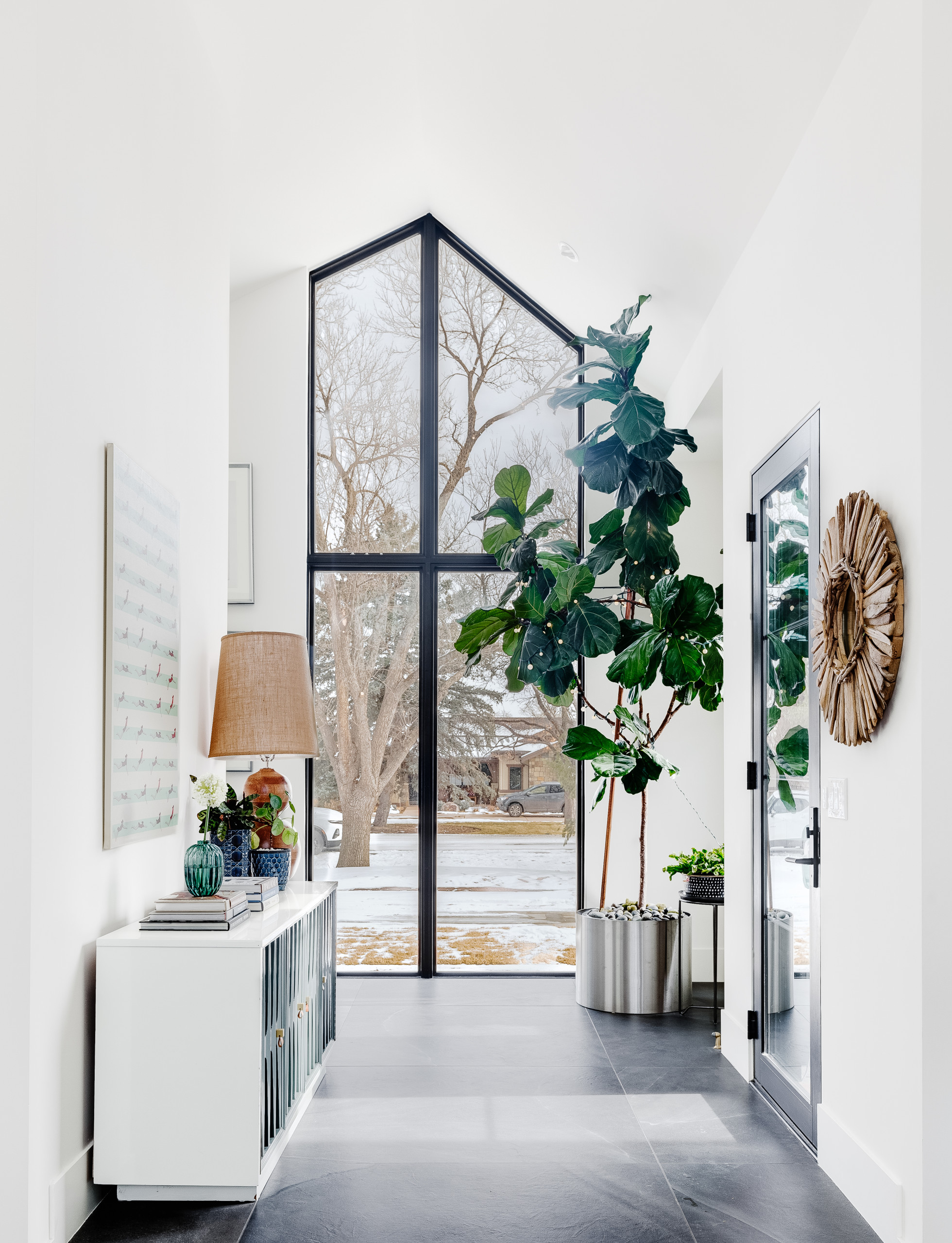 The first surprise is in the entry, where dramatic asymmetric windows kiss the vaulted ceiling. This area illustrates why taking the house down was necessary. The original home’s low roofline with corresponding 7½ foot ceilings was replaced by a higher one composed of scissor trusses. This allowed for the soaring vaulted ceilings and expansive windows that were so important to the architectural appeal of the home. All the windows and doors are low-E, energy-efficient and aluminum-clad.