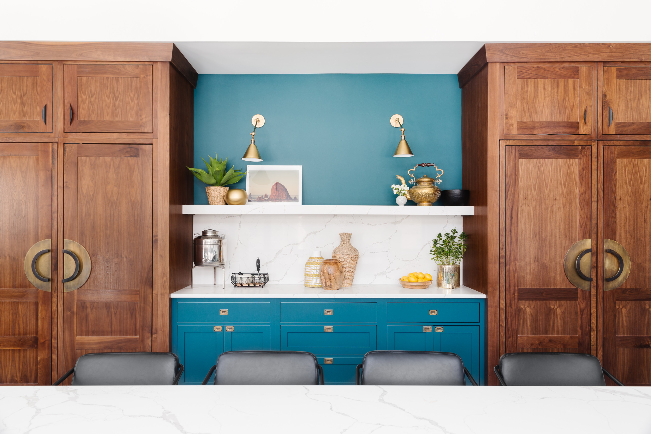 A blue wall and cabinets bring saturated color into the space. The custom walnut cabinets that flank it and brass metal finishes add pleasing warmth. The cabinet on the left contains rollout pantry shelves and a hidden door to a walk-in pantry behind it, where small appliances are stored. The cabinet on the right contains a Viking fridge and freezer.