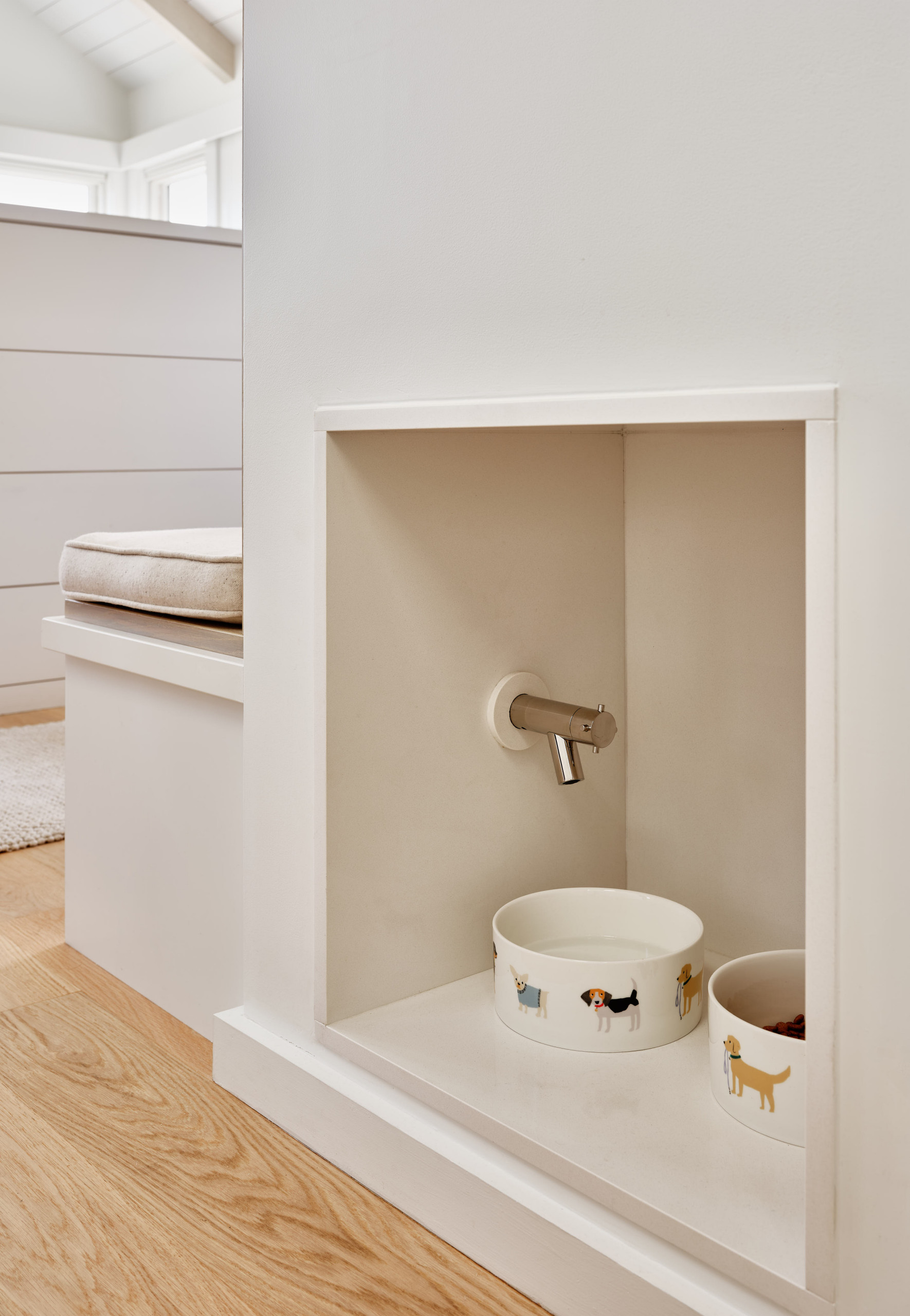 The dog bowls even have a designated and plumbed spot just around the corner from the bench. The niche is lined with a solid-surface material to protect it from splashes. And the spoked faucet knob is a little nod to the seaside location.