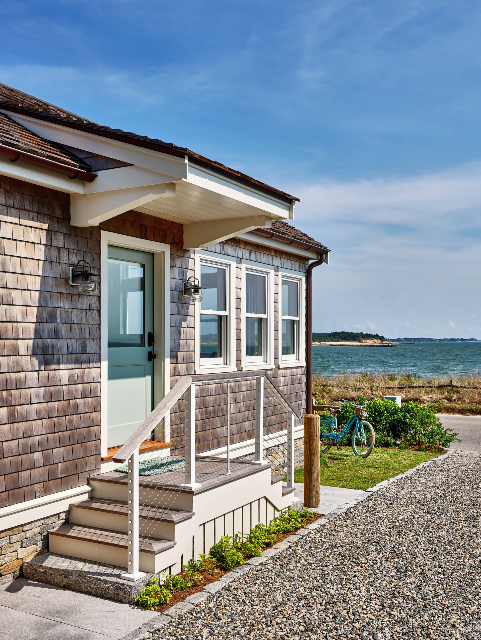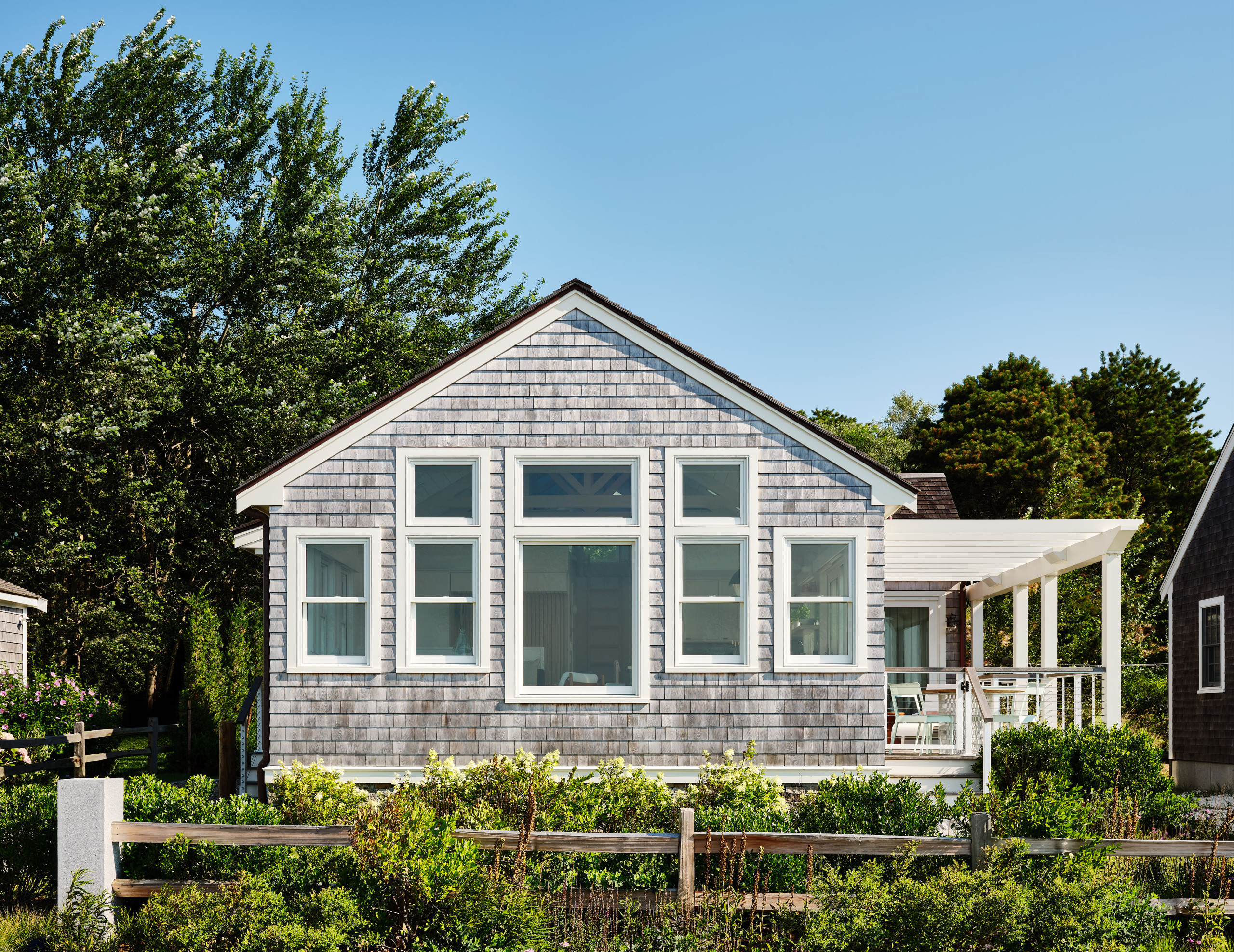 The siding is classic white cedar shingle with white trim. The shingles are weathering to a soft gray, blending the home into the landscape as well as the neighborhood.