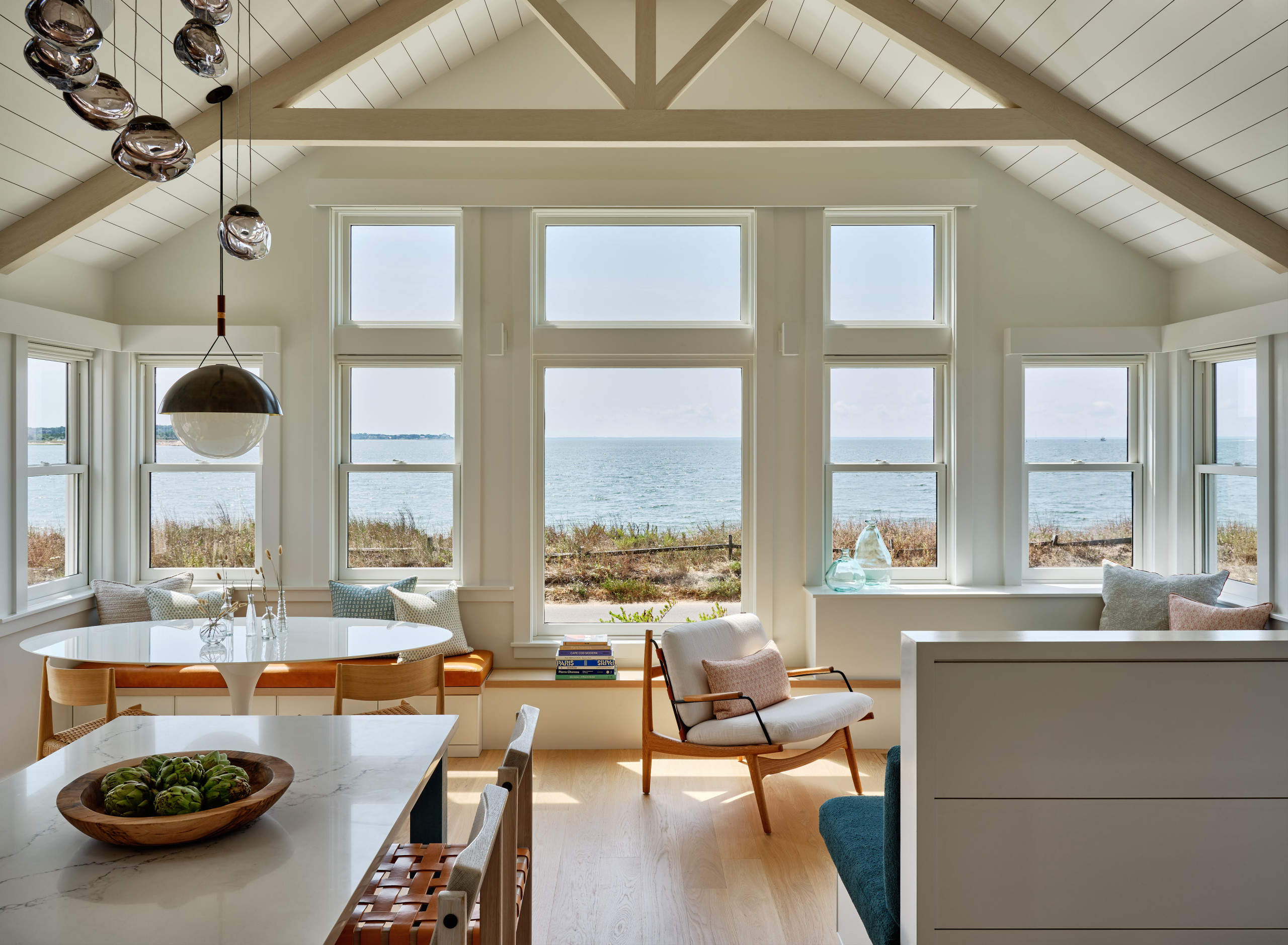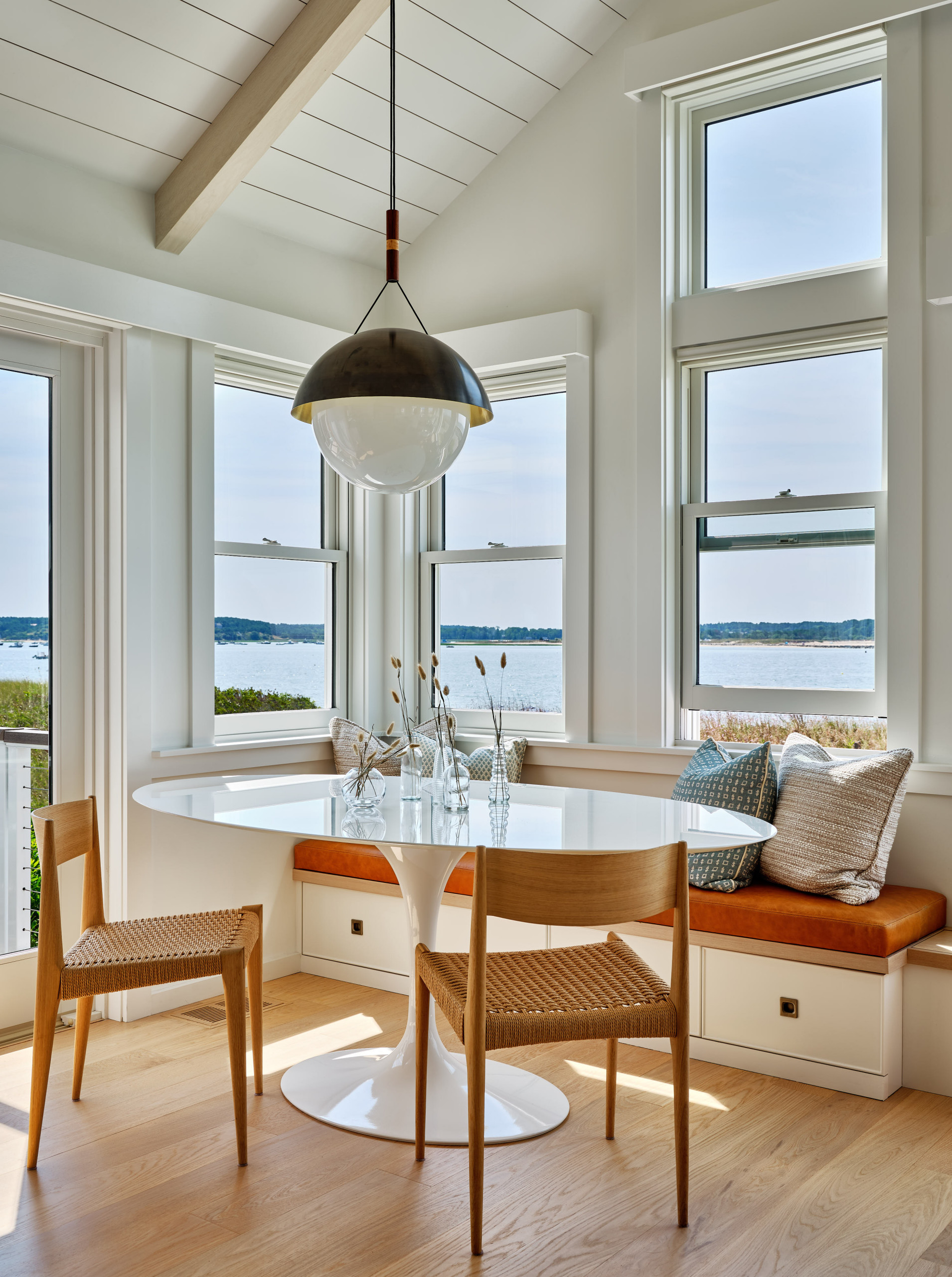 Just to the right of the kitchen is a built-in dining bench with storage underneath. Eleven Interiors paired it with a vintage Saarinen Tulip table and new dining chairs. The fun, contemporary globe light hanging above the table was selected in part because of its resemblance to a buoy.