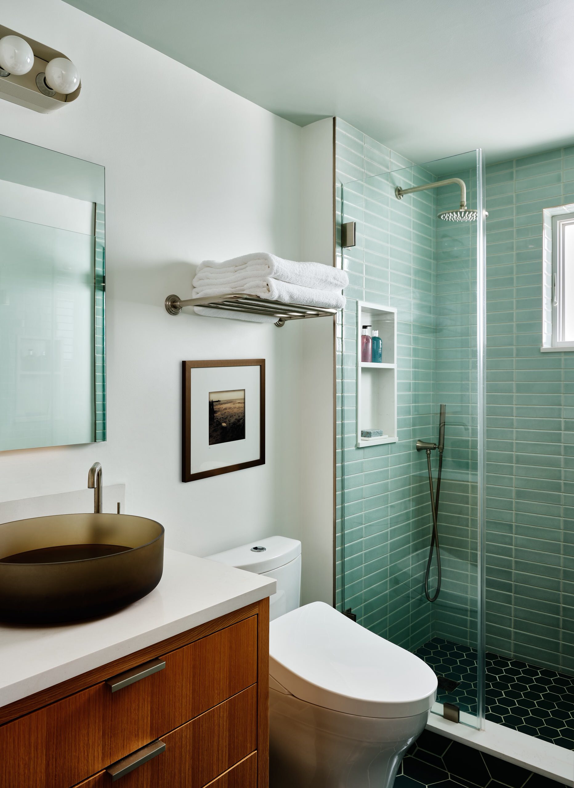 The other bathroom has a vessel sink and bidet toilet and aquamarine wall tiles. Its warm, medium-toned wood vanity calls to mind the wall paneling found in old beach cottages.
