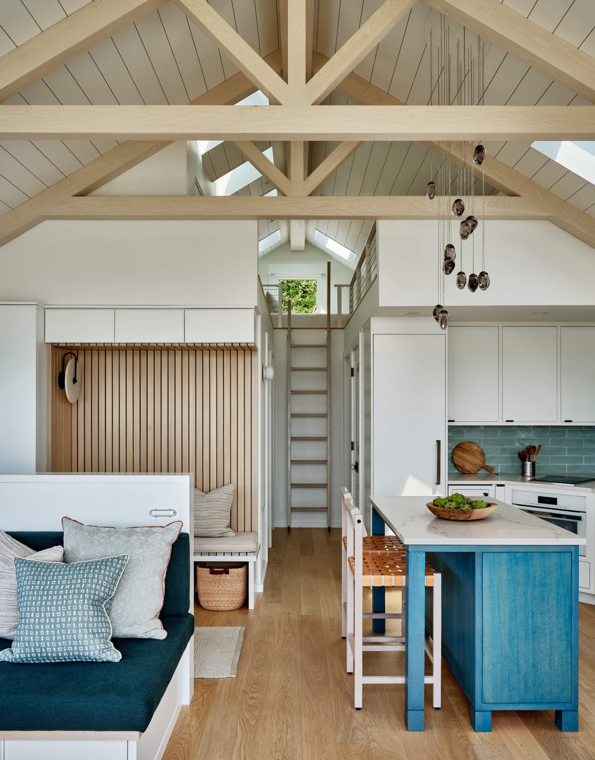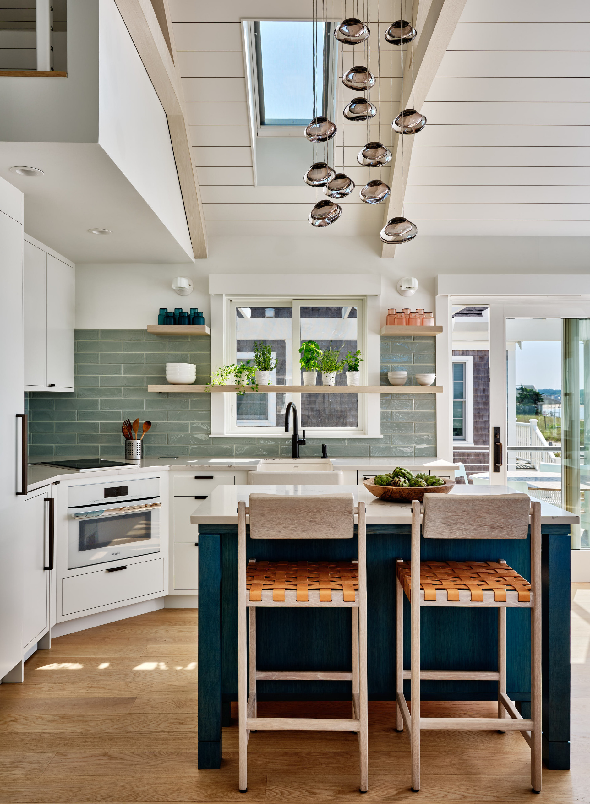 The home’s subtle coastal references also include a custom-designed chandelier, which consists of 12 handblown tinted glass orbs that resemble the oysters for which Wellfleet is famous. It hangs over a small island with a Caesarstone top and a base that’s stained blue so its wood grain shows through.