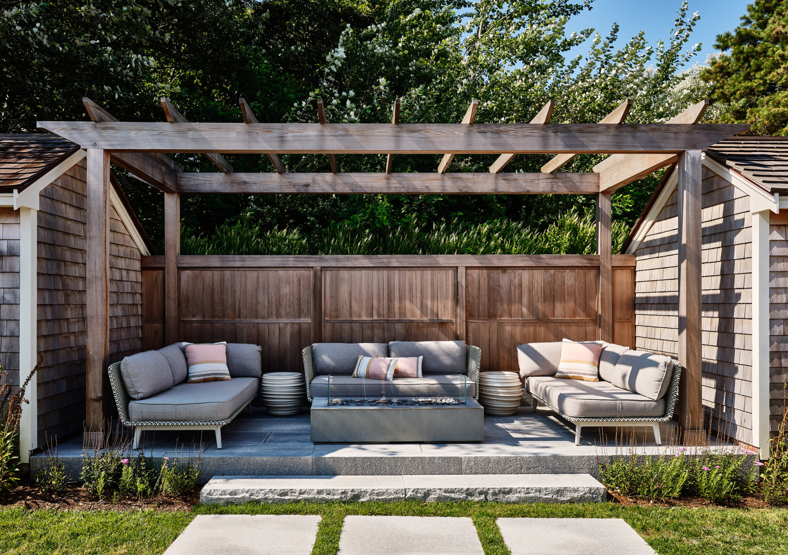 The landscape architects played with the elevations on the site to create this raised seating area, which is flanked by the two storage sheds.