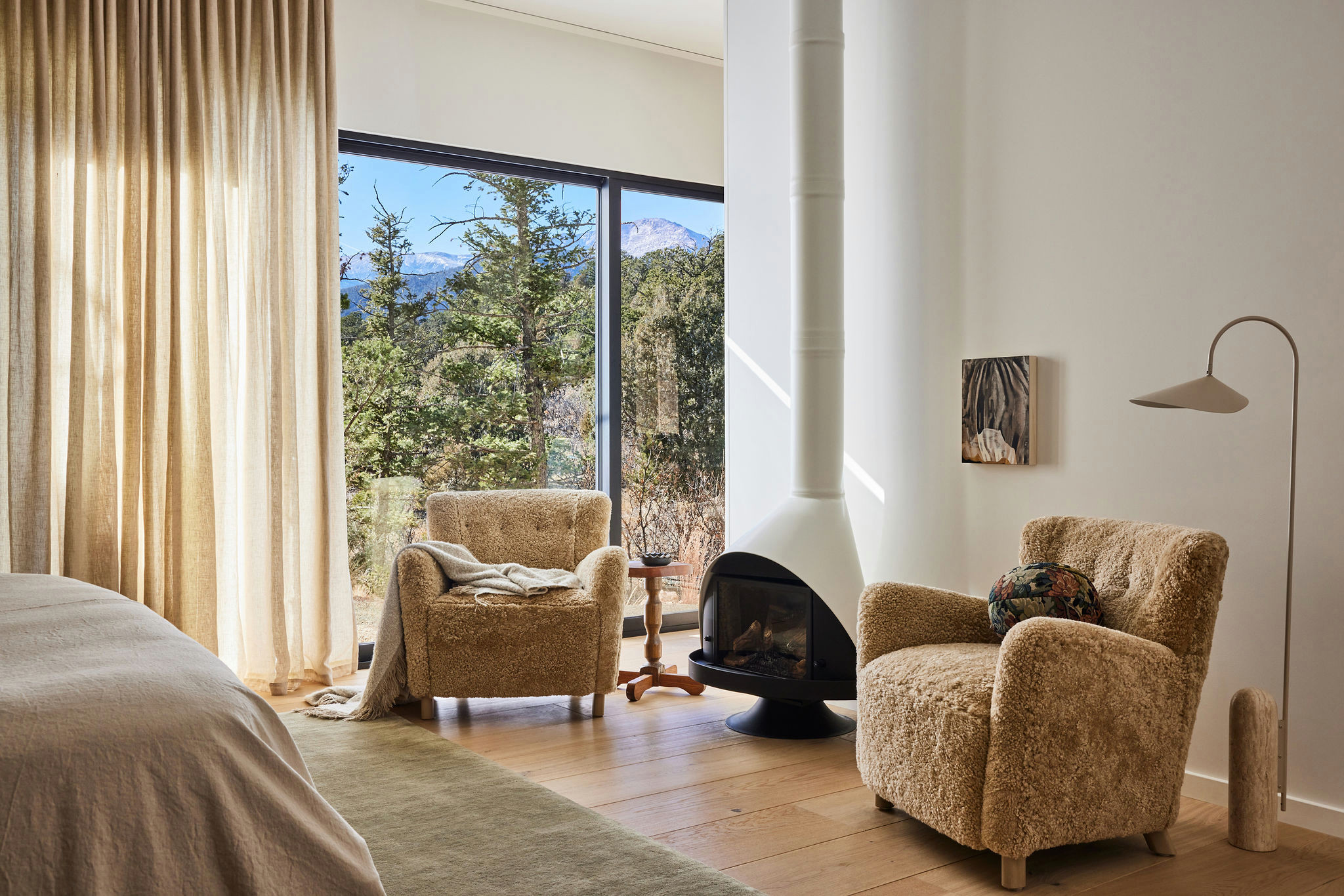 The other side of the room has a toasty Malm wood stove and armchairs that are as fuzzy as a teddy bear. Tall windows and doors allow big views of the pines and the Rockies beyond.
