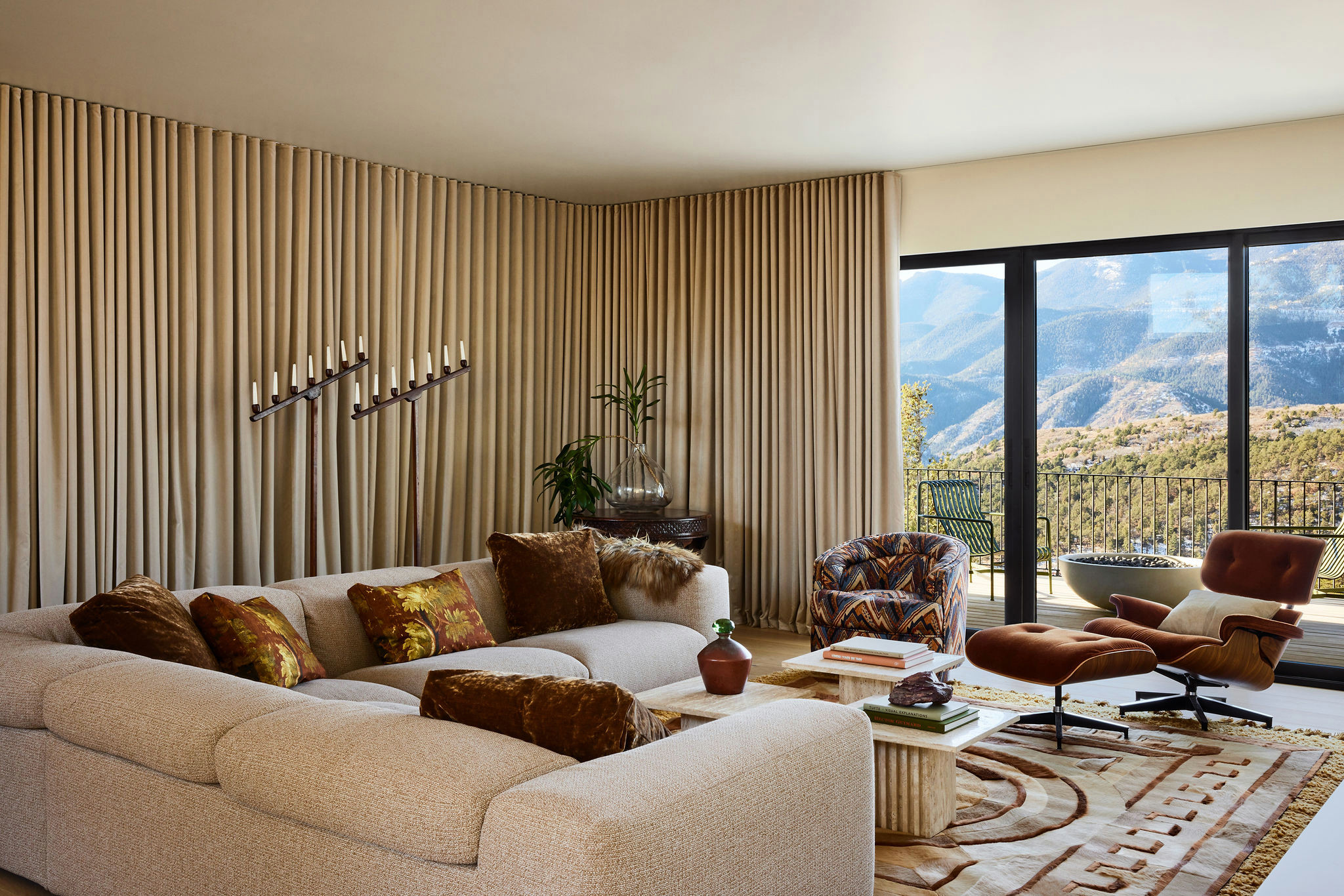 Brit oriented the house so the main public spaces, including this living room, the dining room and the kitchen, had expansive views of the Rocky Mountains. Large windows and doors keep the views wide open.