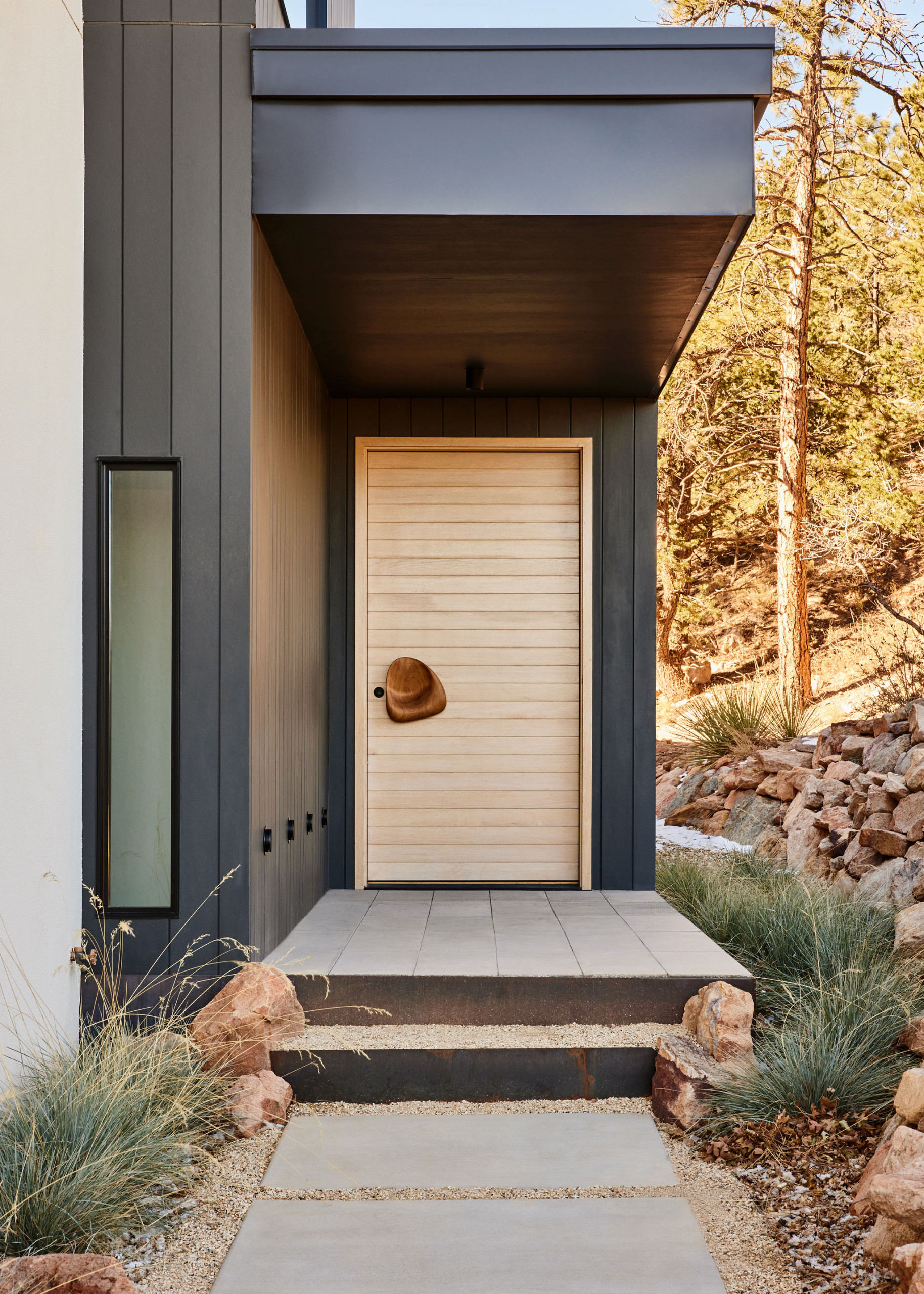“The house is tucked in the hill down from the road, and there’s a processional approach from the driveway to this entry,” Daniel says. The retaining wall on the right is composed of sandstone rocks, which are found all over the property and helped inspire the interior color palette.