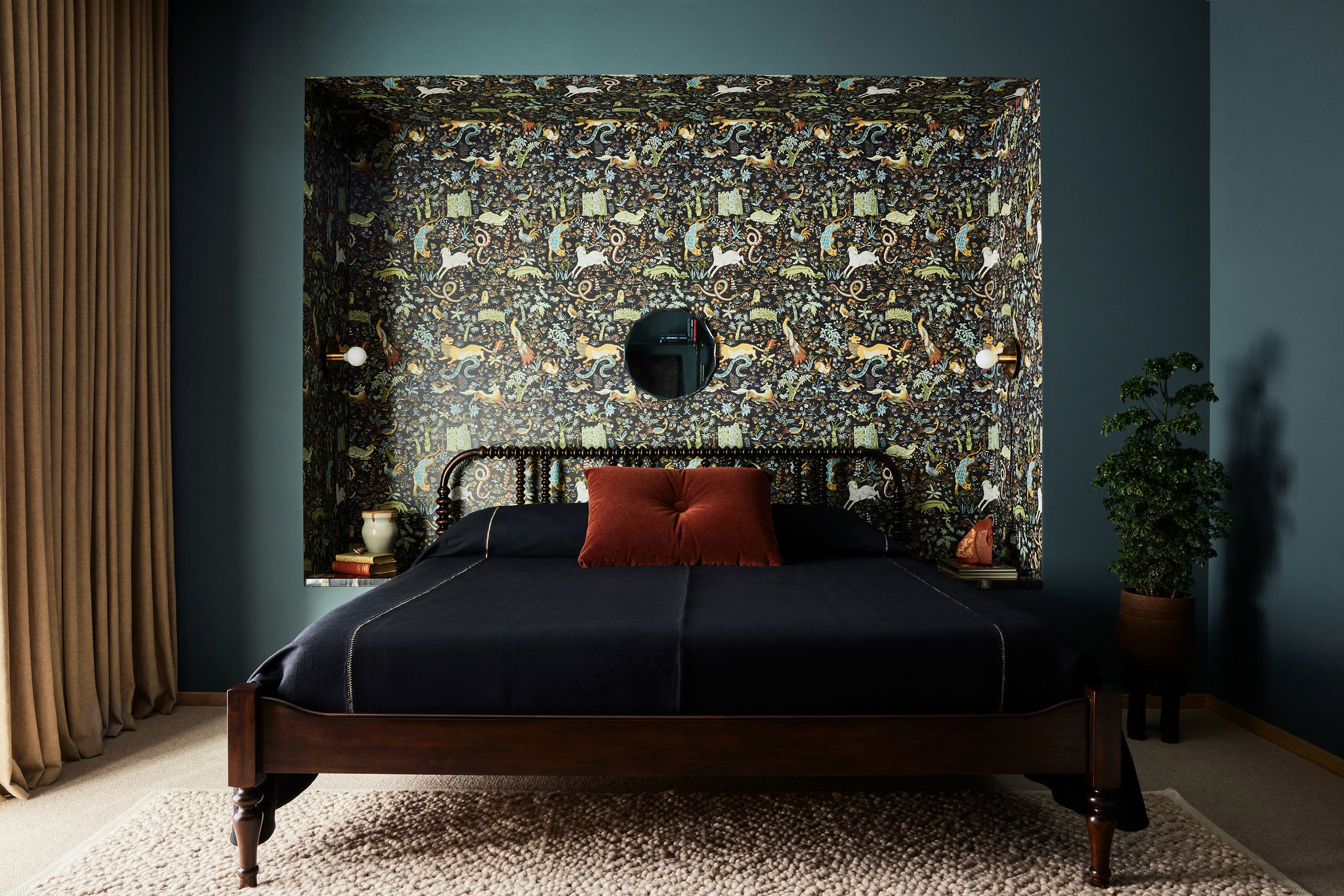 Brit designed this moody-yet-playful room for herself and Daniel. “I’d say the green room with the storybook-like wallpaper is another ‘lime green Camaro’ moment in the house,” Daniel says.