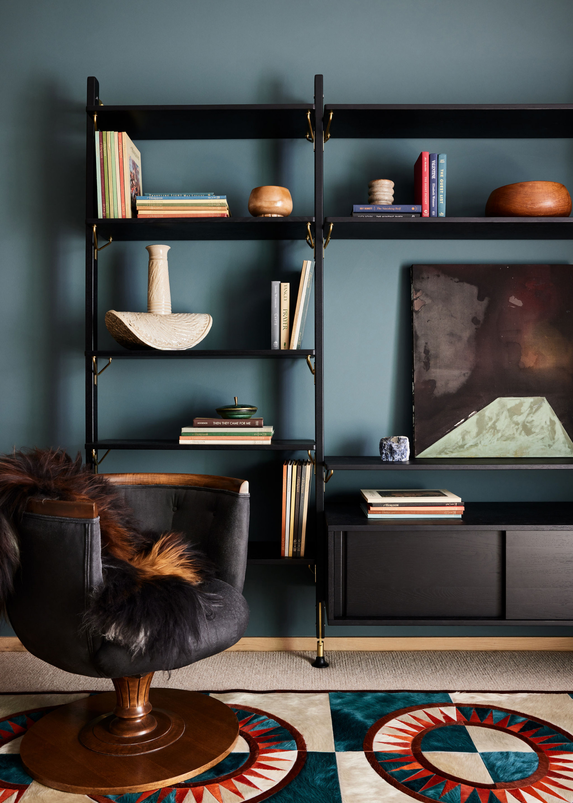 A wood-and-leather swivel chair, artwork and another hair-on-hide rug add to the funky feel of the guest room.