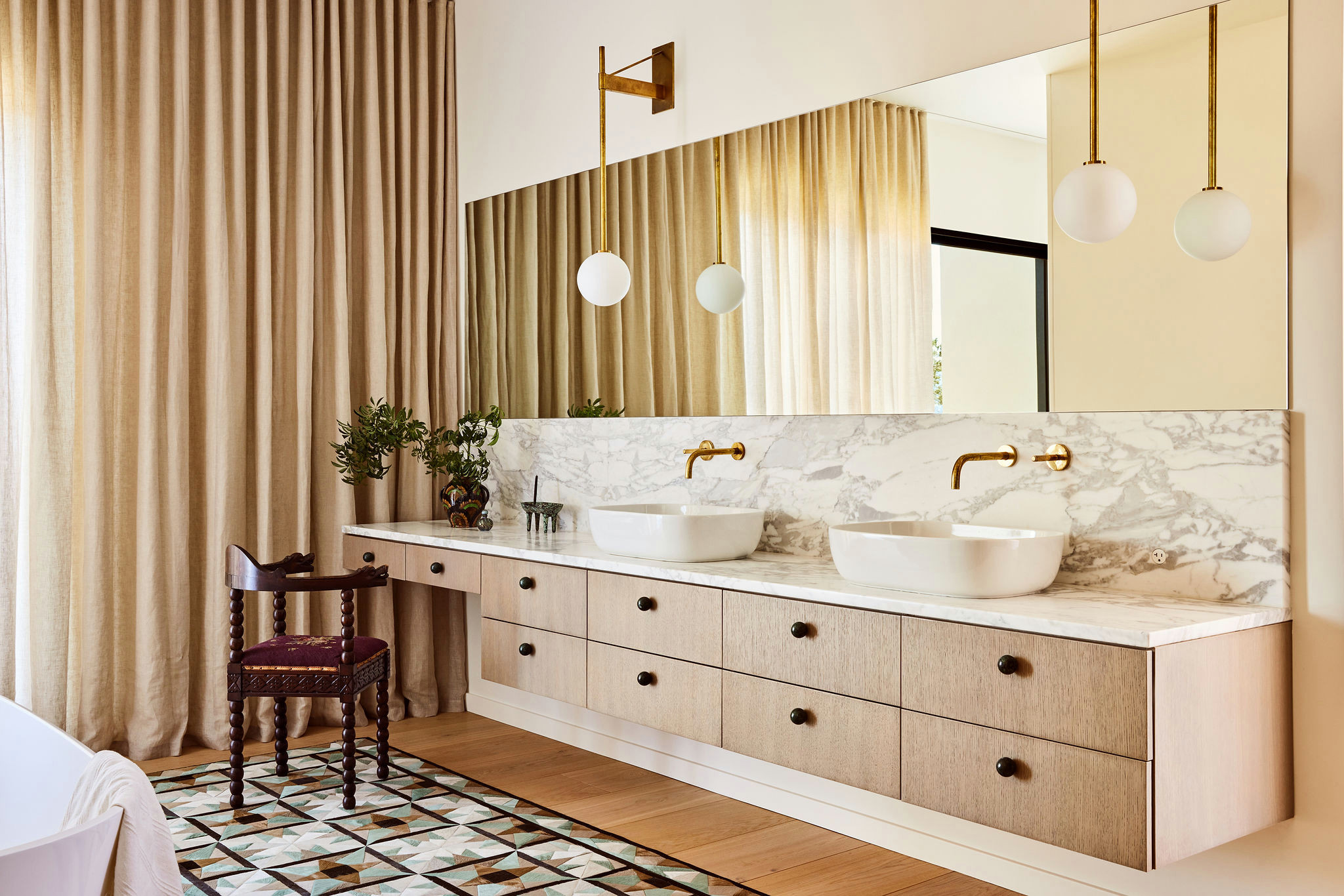 One of Debbie’s must-haves was a dressing table area, which Brit placed at the far end of the wall-mounted vanity. The extra-high backsplash meets a large mirror, while globe lights extend down from above. The funky factor comes in through the curved vintage chair and hair-on-hide rug from Kyle Bunting.