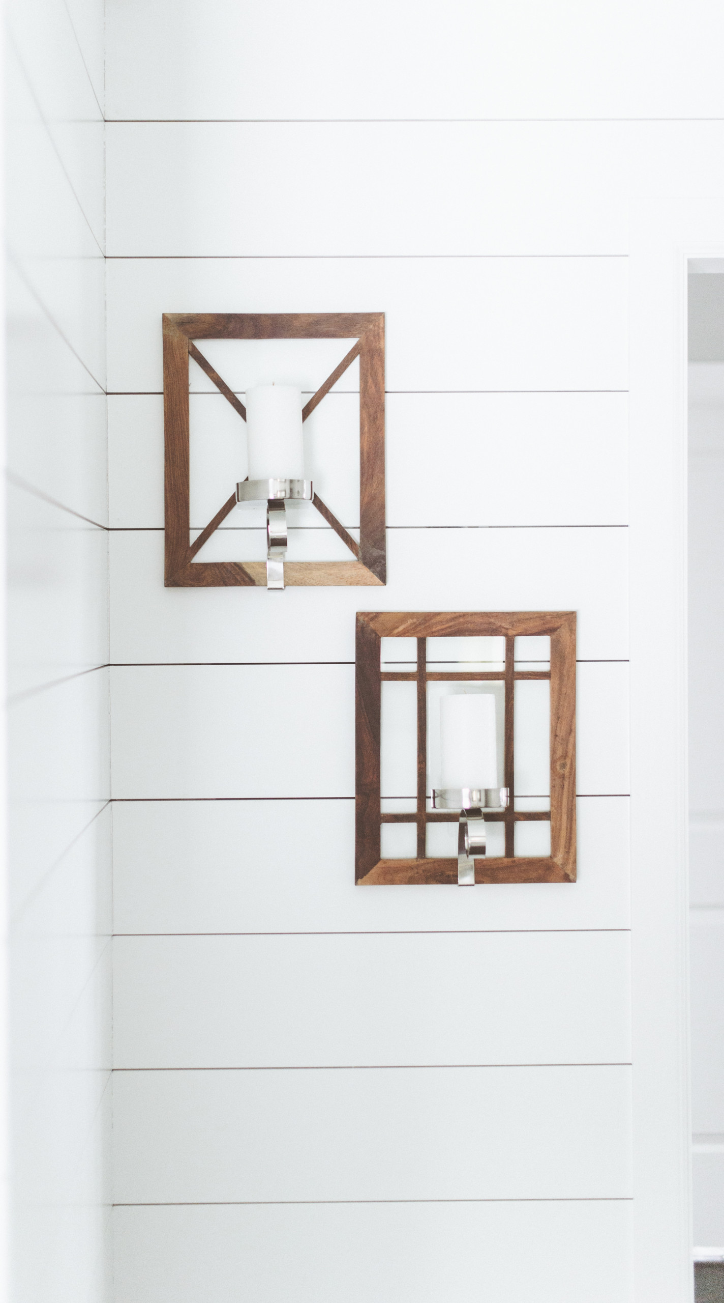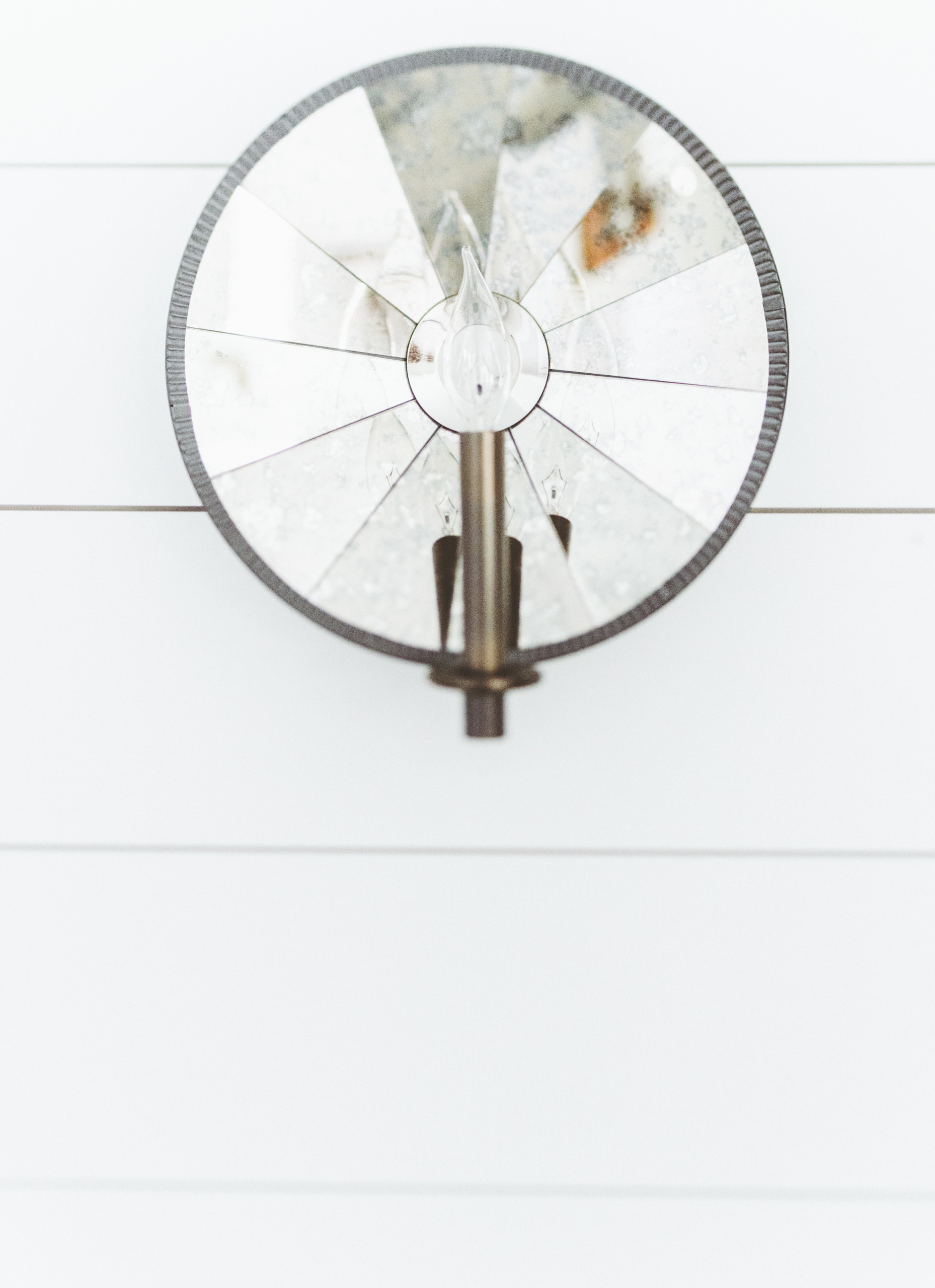Mirrored sconces with vintage appeal light up the entryway and the stairwell.