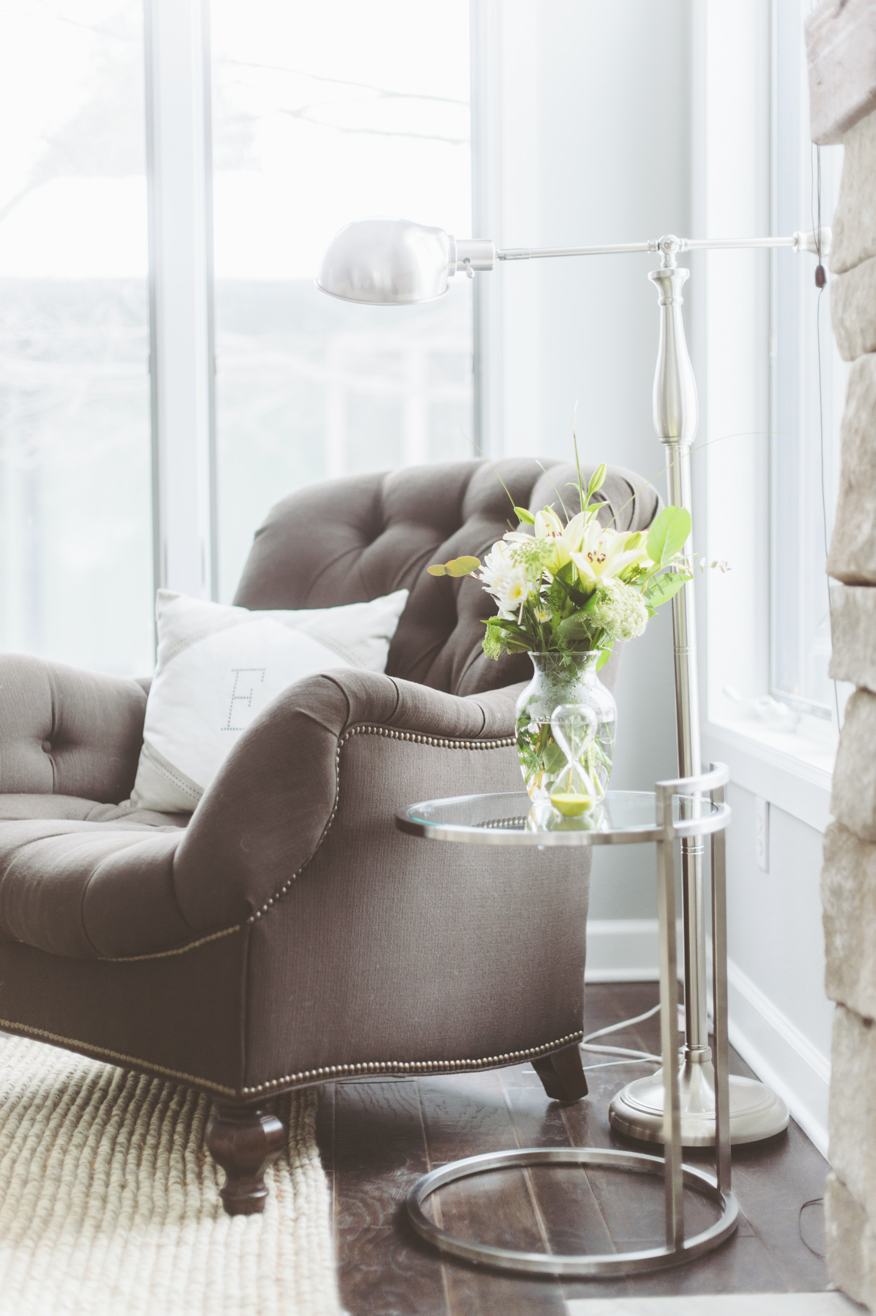 A cozy tufted chair paired with a modern chrome tubular side table and apothecary floor lamp mix traditional and modern, for a comfortable reading corner.
