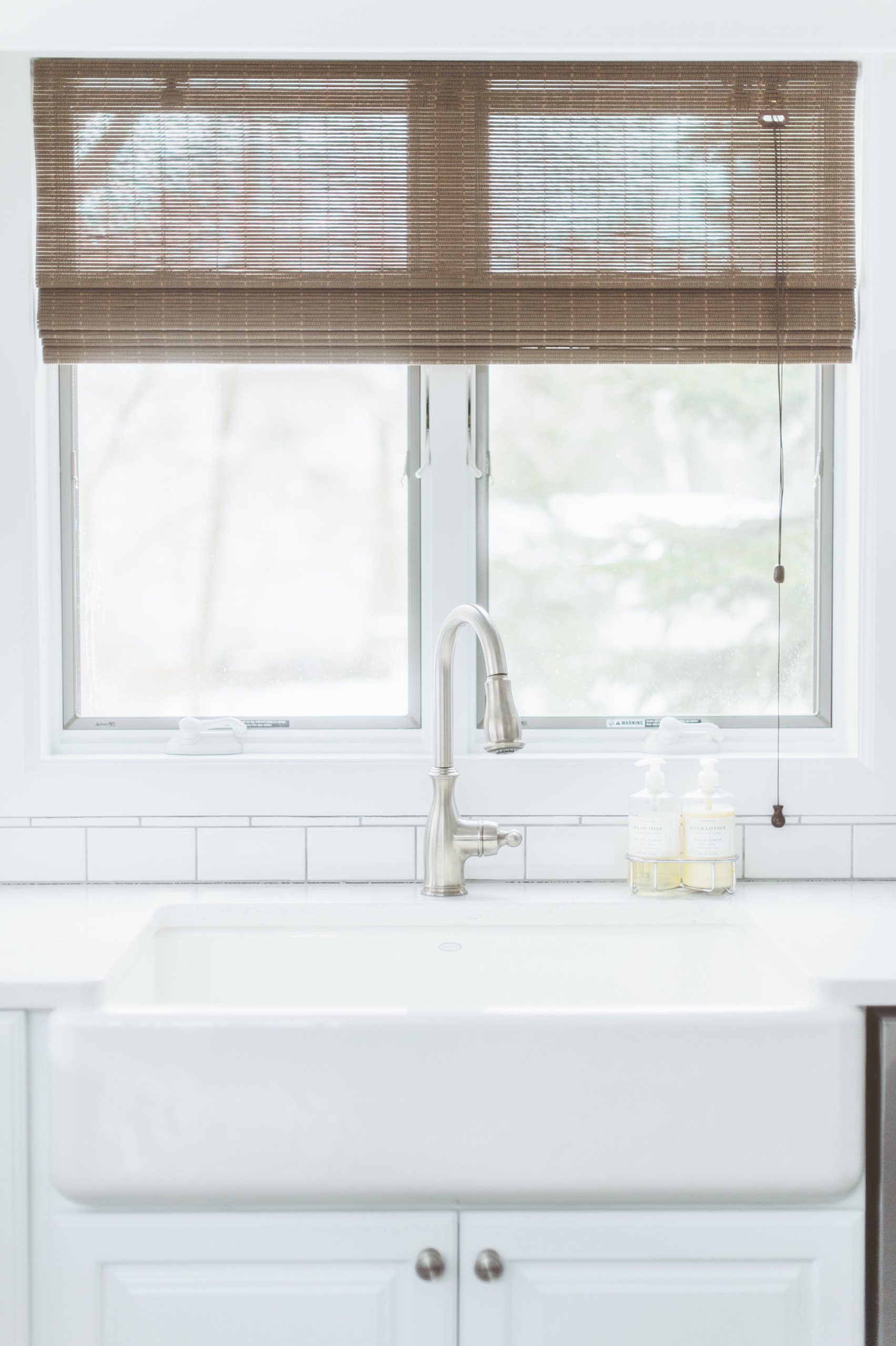 A white apron-front sink marries modern white and a nostalgic farmhouse form.