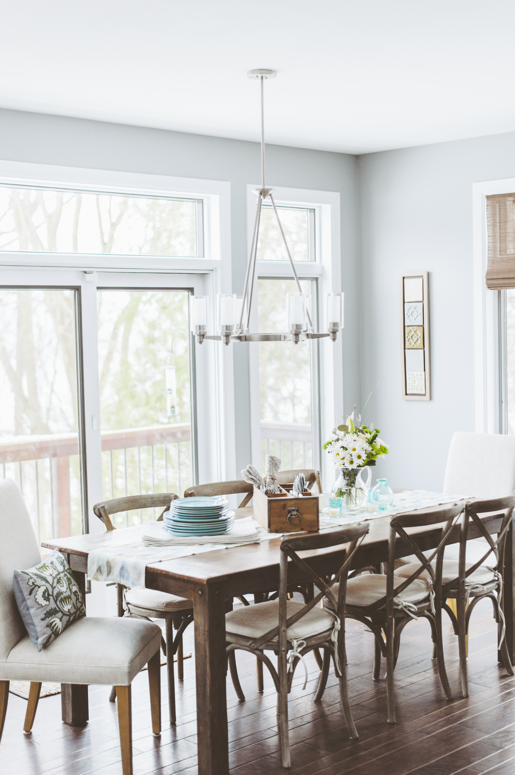 Chandelier: Circolo Collection, Kichler; dining chairs: Madeleine, Restoration Hardware