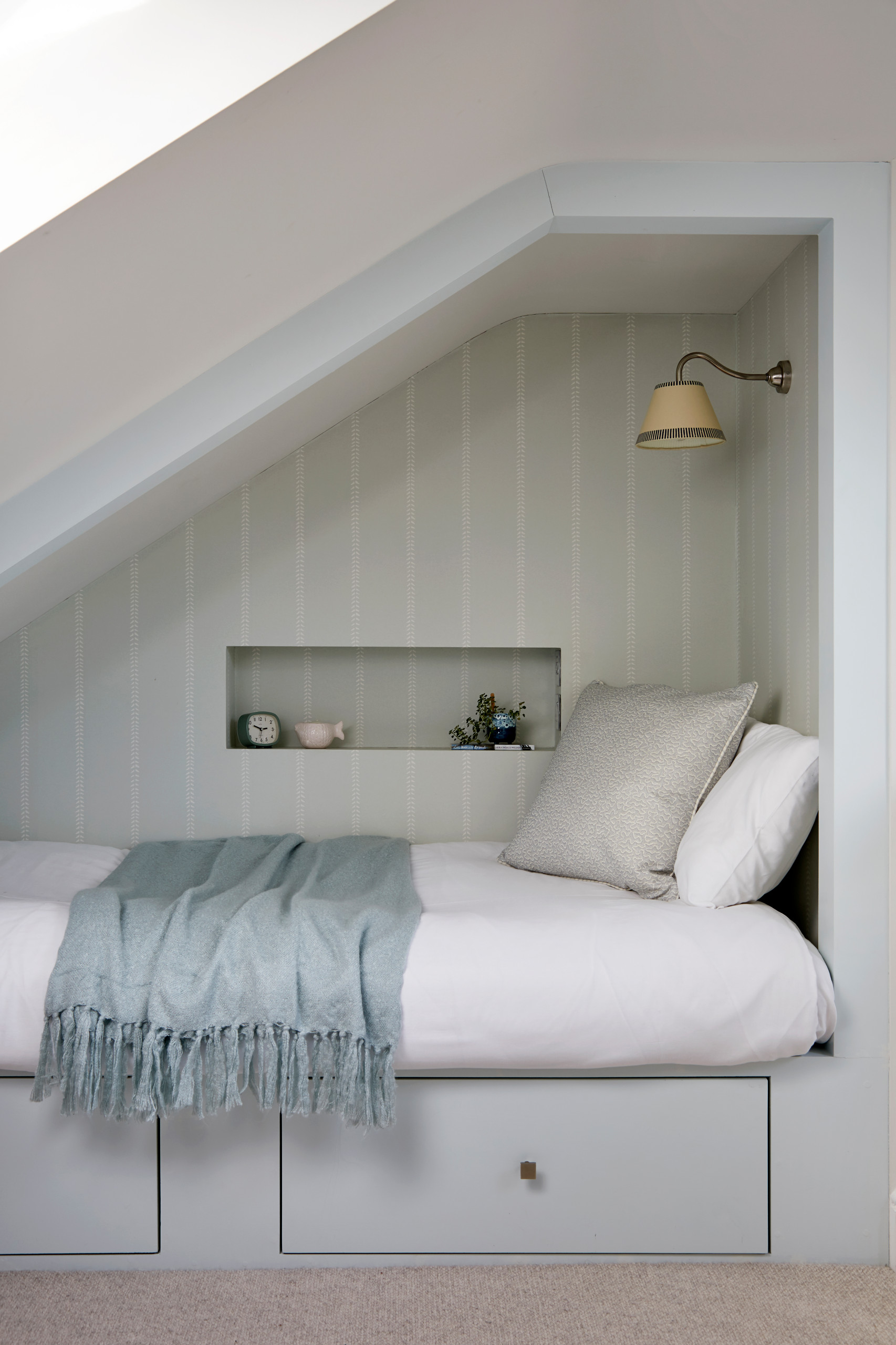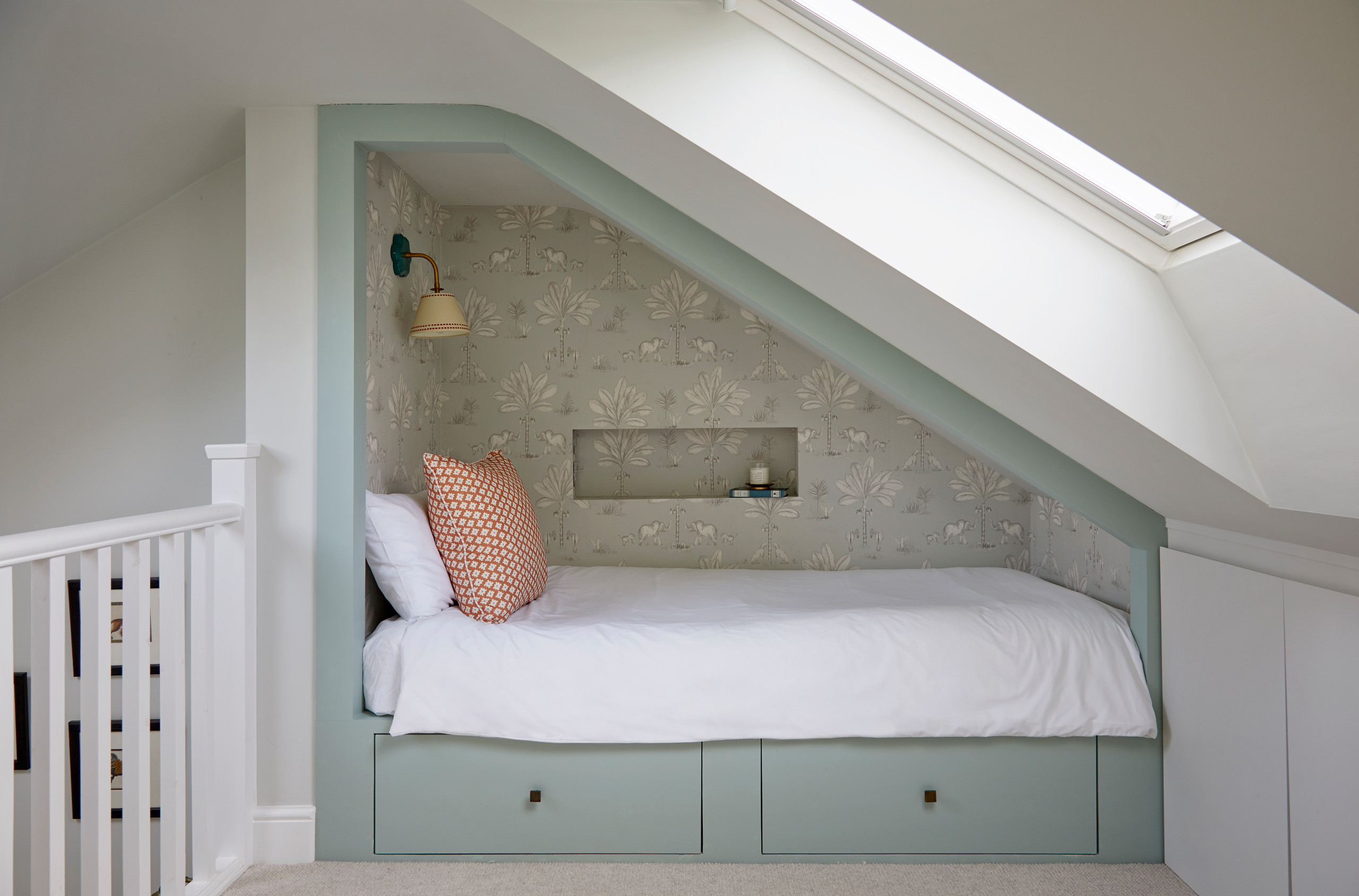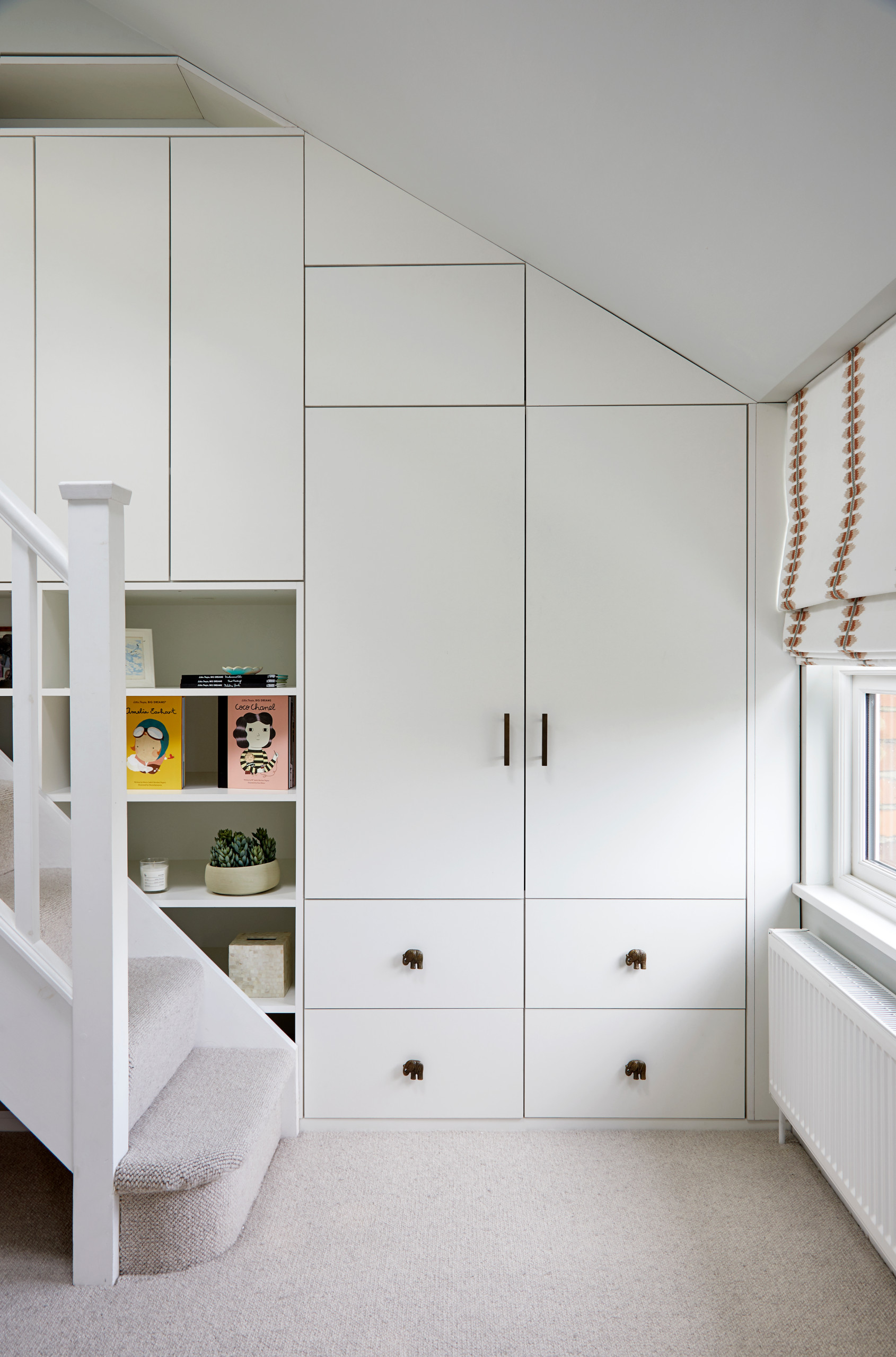 She then created storage running up the wall alongside the stairs. “I designed it meticulously, following the lines of the roof and creating floor-to-ceiling wardrobes, so they can store everything there,” she says.