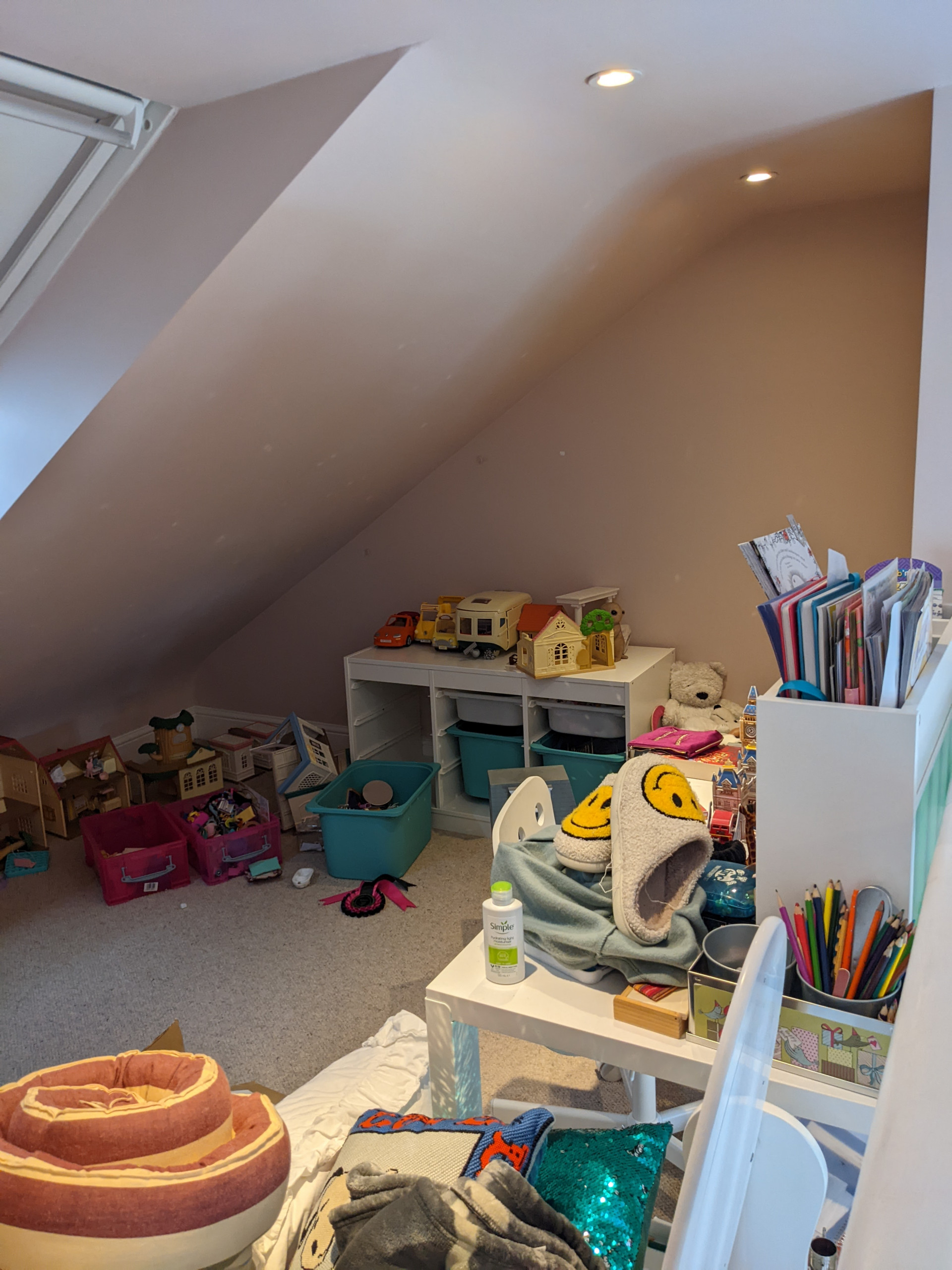 The two oldest daughters have bedrooms up here built into the eaves. The rooms are exactly the same layout, both on two levels. Each originally had a single bed on the lower level and then steps going up to a play area containing their toys.