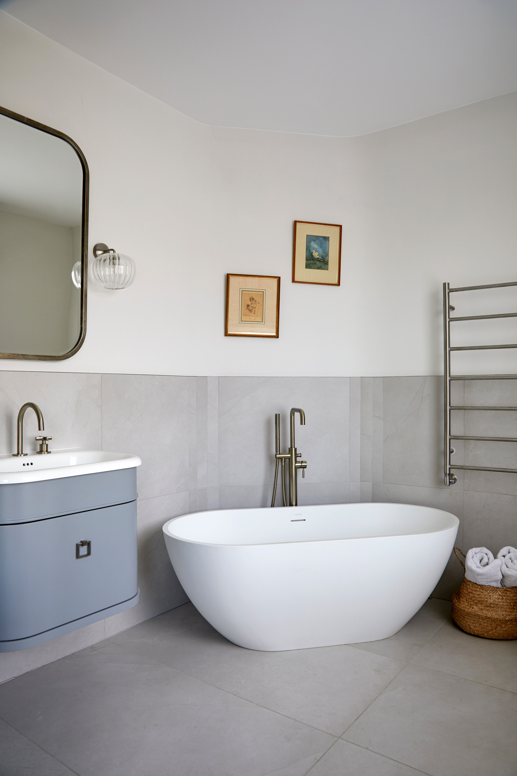 The family bathroom contains a compact bath and a shower. “I changed the handle on the [new] vanity unit to make it a bit more interesting,” Valentina says.