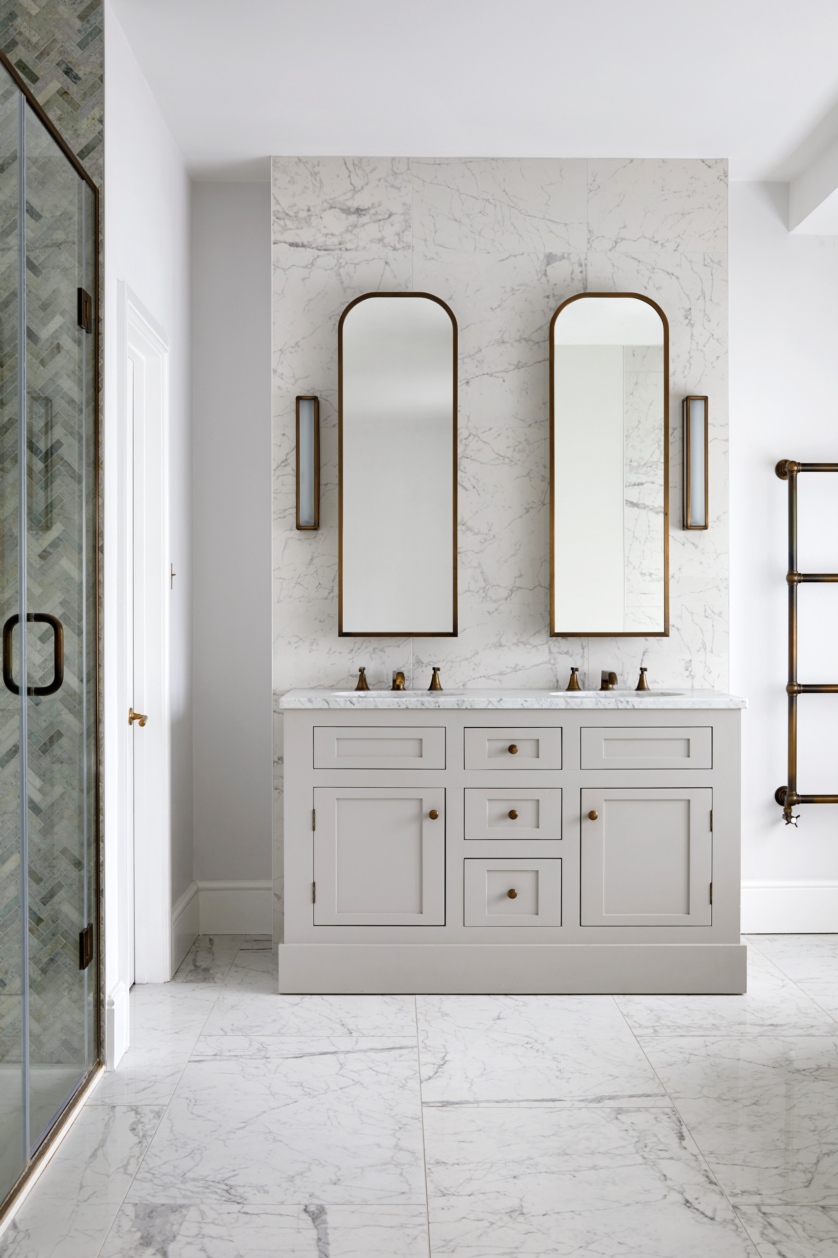 Vanity unit; brassware; mirrors; lights, all Porter.