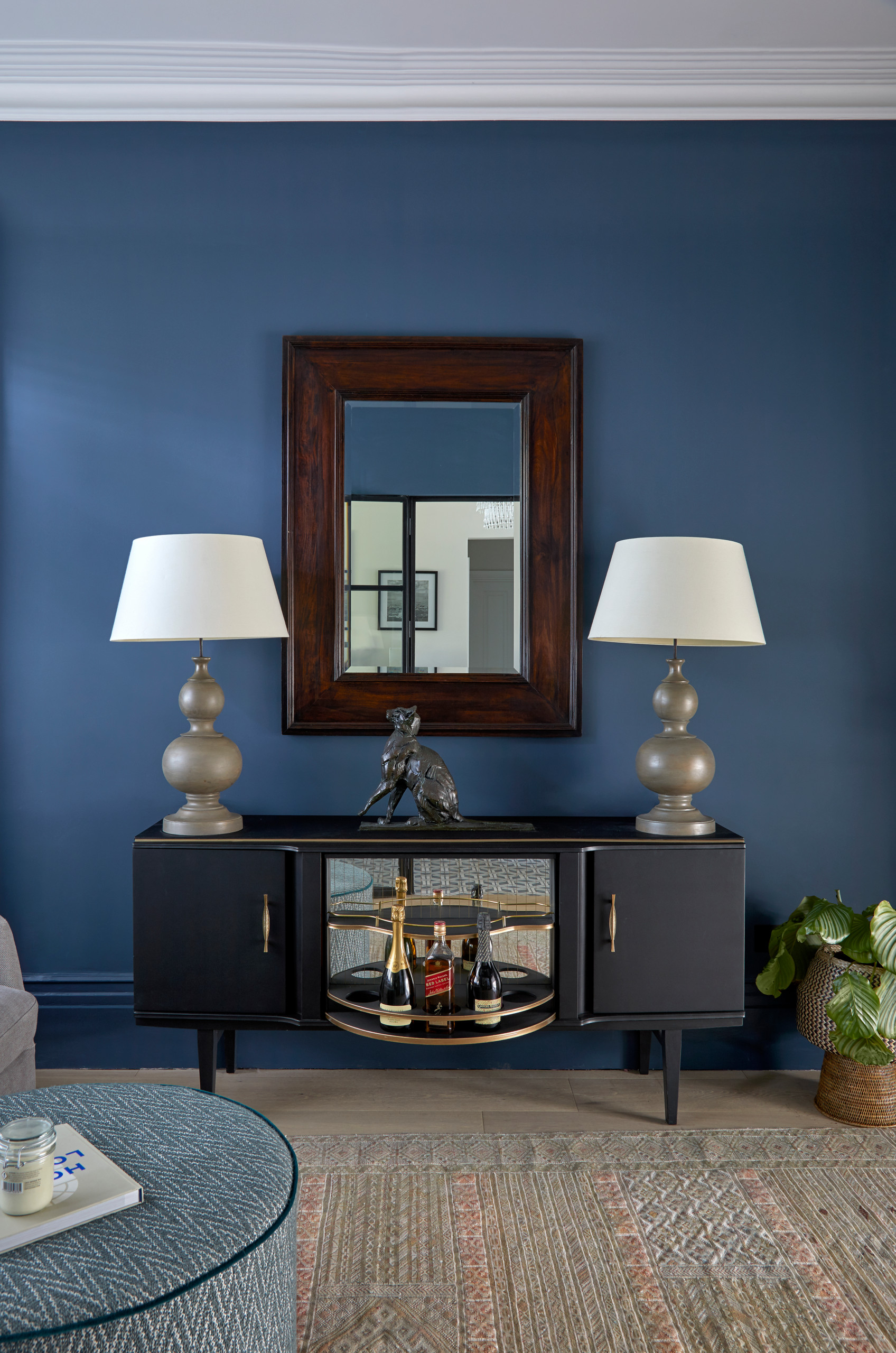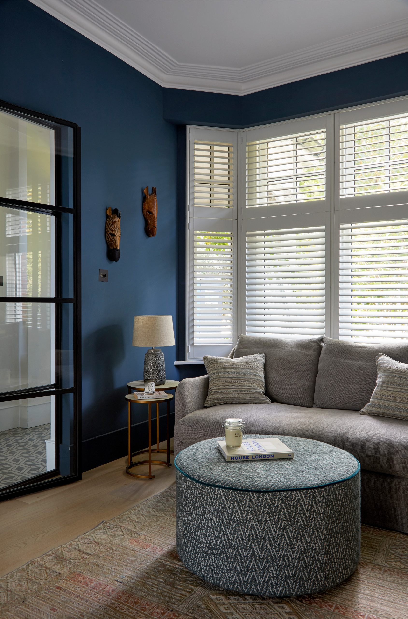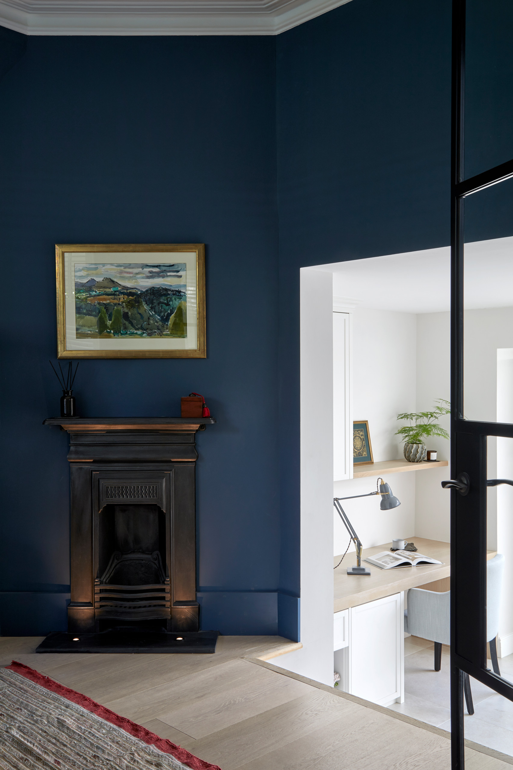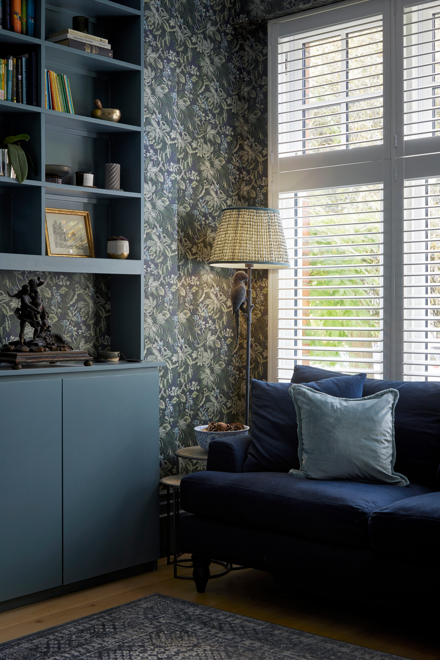 The front of the house, which contains this living room and a snug, faces west. “It can be quite dark throughout the day, so that’s where I put the darker colours to really give a sense of cocooning and an evening feeling, with suffused lighting,” Valentina says.