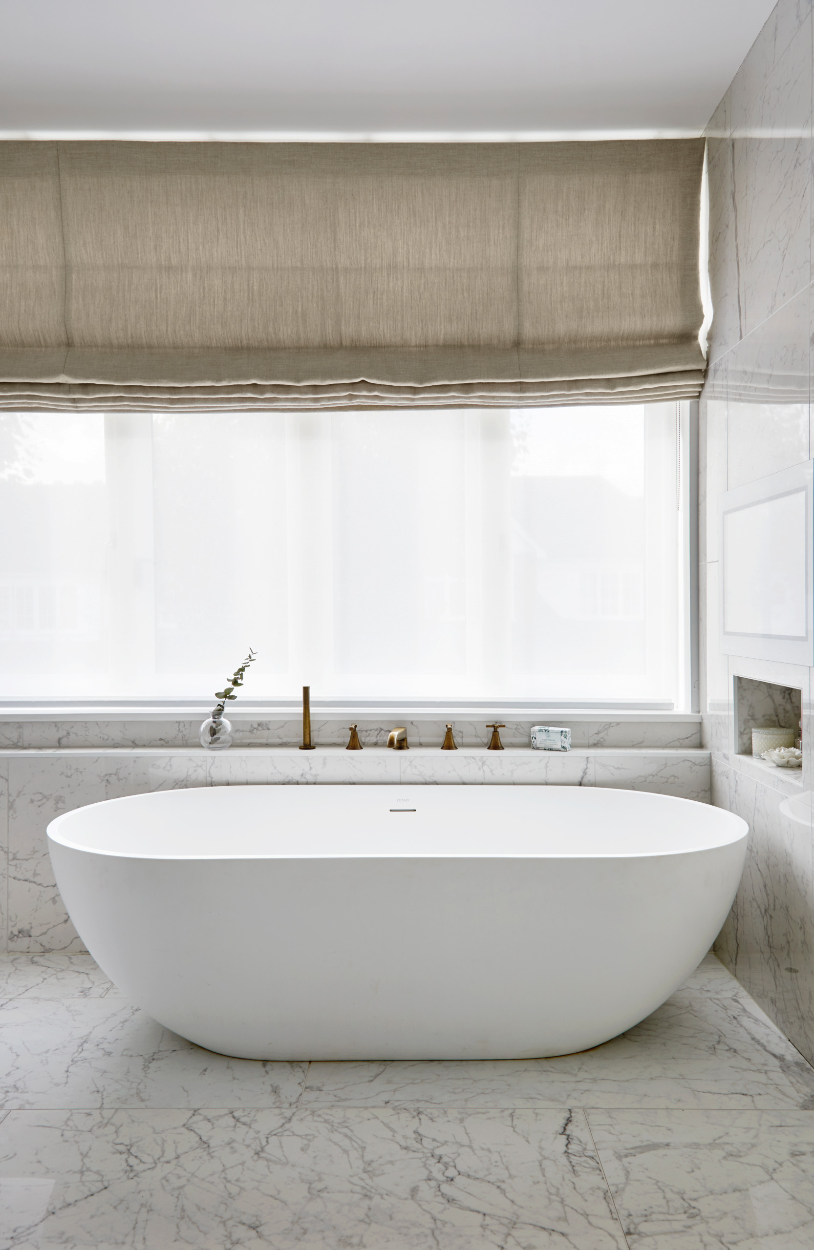 Valentina chose high-quality porcelain tiles that look like marble for the floor and some areas of the walls.