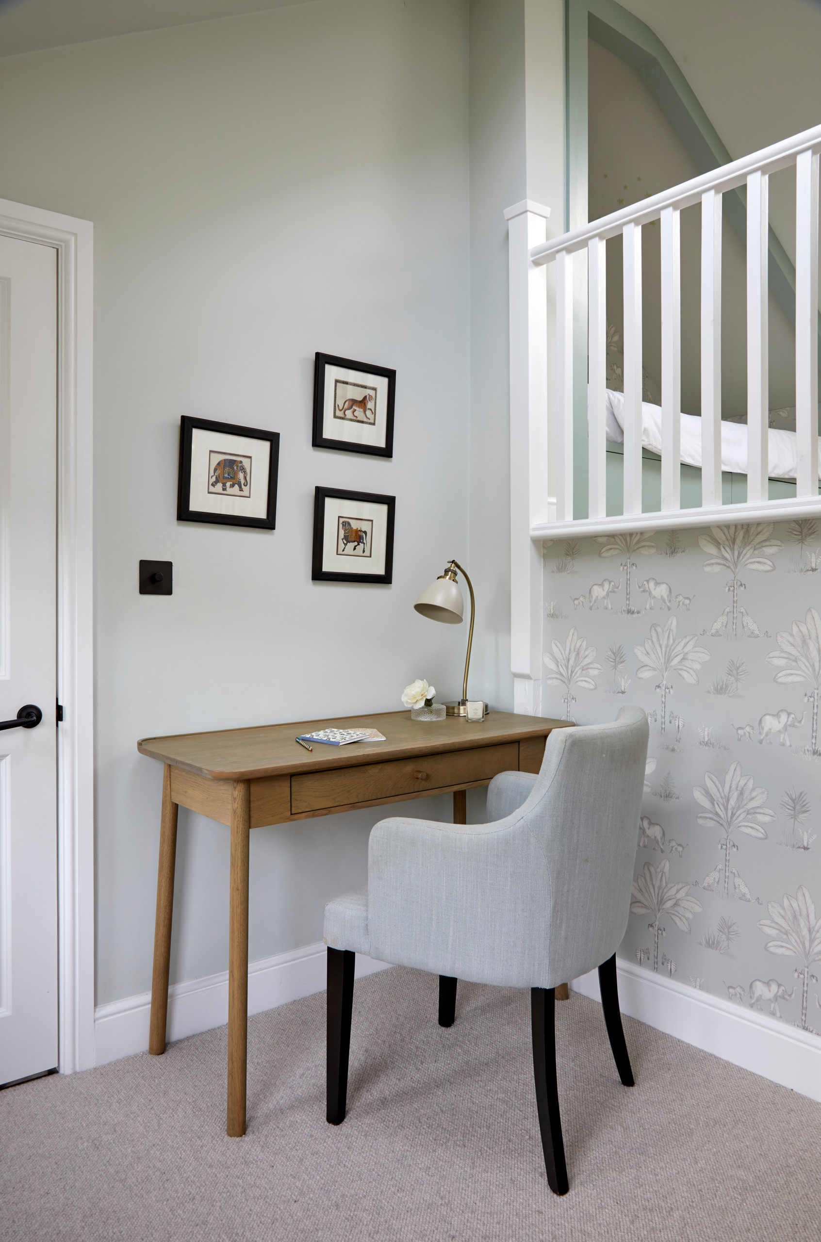 On the lower level of each room, there’s now space for a desk. The daughter in this room loves animals, so Valentina sourced a wallpaper featuring elephants and giraffes, and even fitted elephant drawer knobs on the storage (see previous photo).