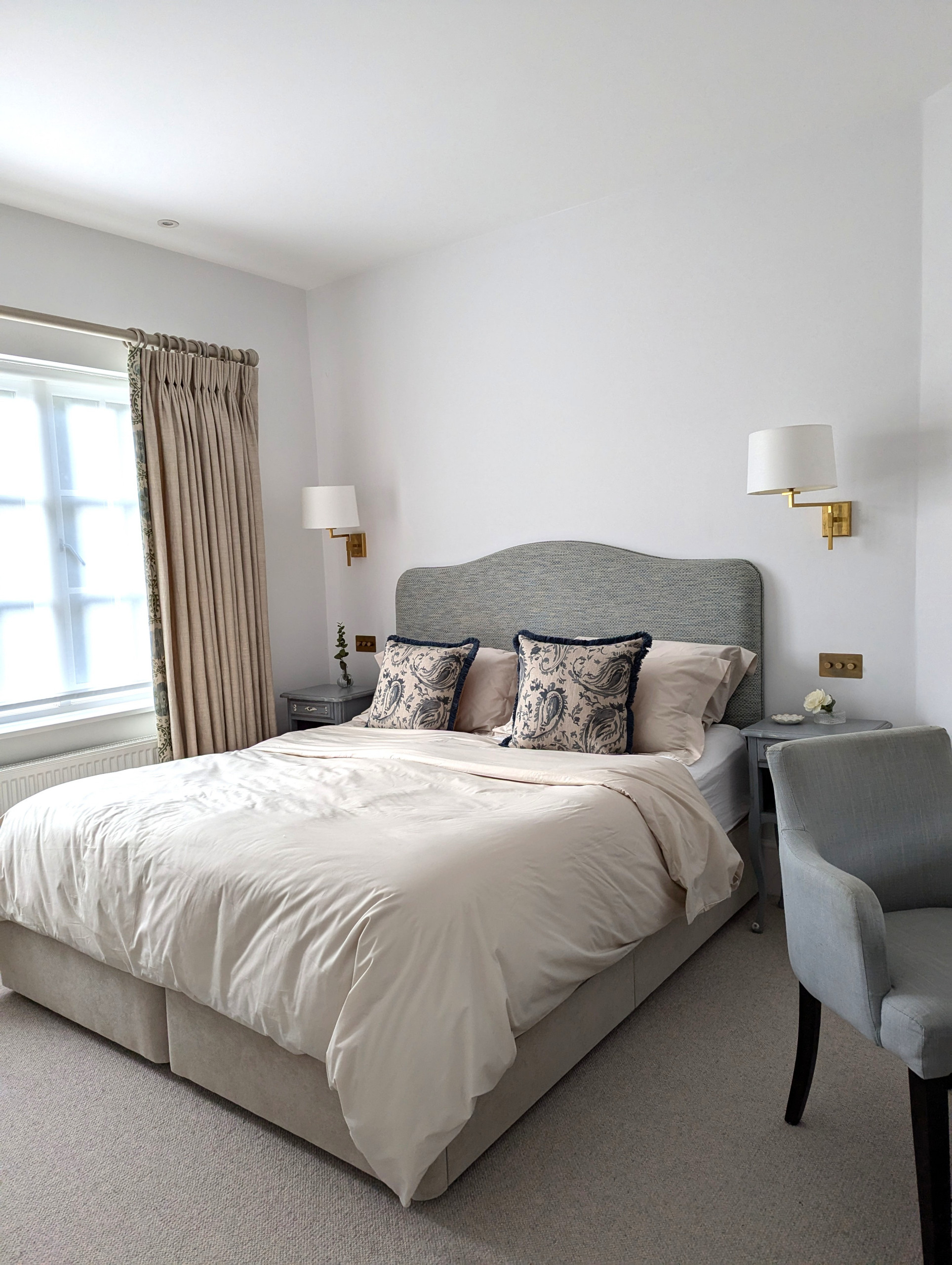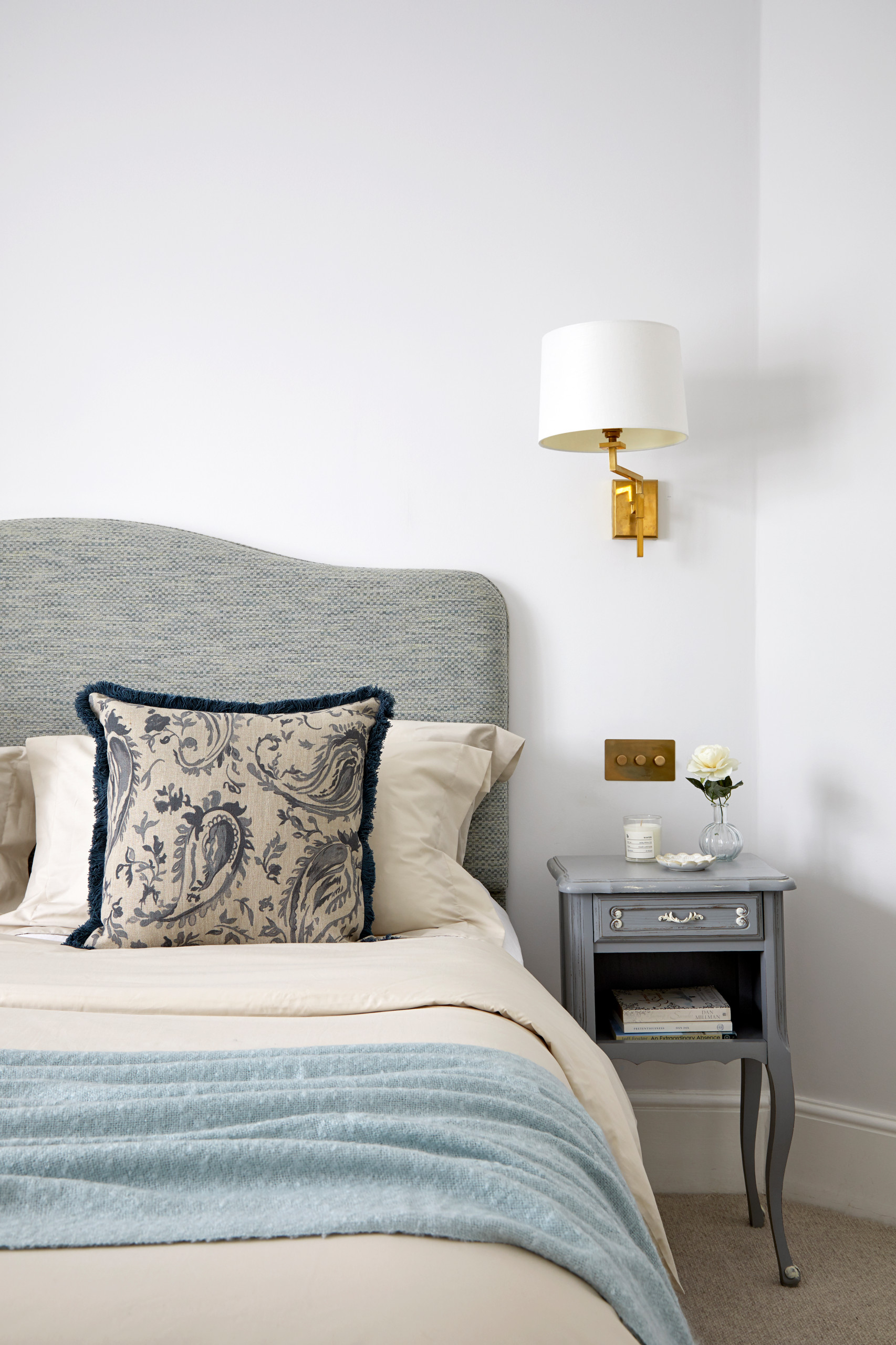 Valentina had this vintage bedside table painted in a light blue-grey to suit the scheme.