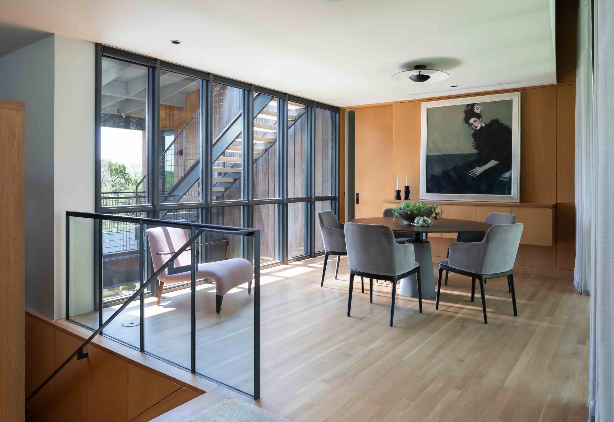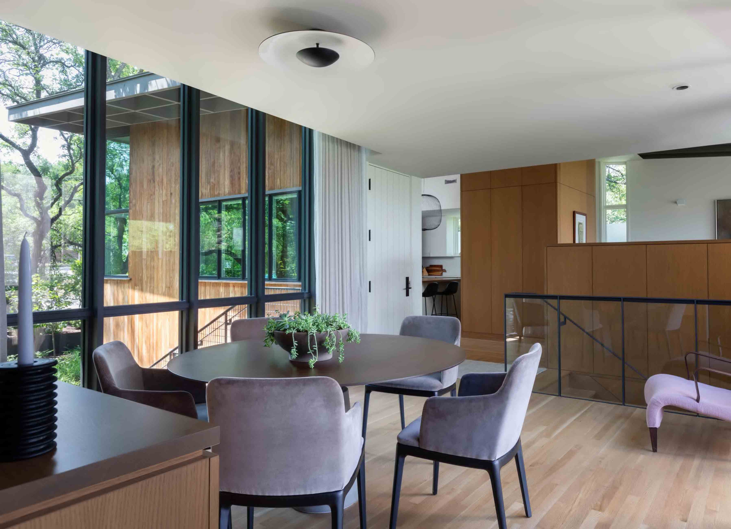 Natural materials and thoughtful design let this family home in the hills near Austin, Texas, blend in with its woodsy landscape. Despite its rural feel, the modern home has a near-urban location with expansive views of downtown Austin. The pros at Cuppett Kilpatrick Architecture + Interior Design included sustainable features, and the home is sited to take advantage of breezes and views. Currently used as a full-time residence, the house can be divided into two homes in the future, with the possibility of closing off the bottom floor to rent as a separate unit.