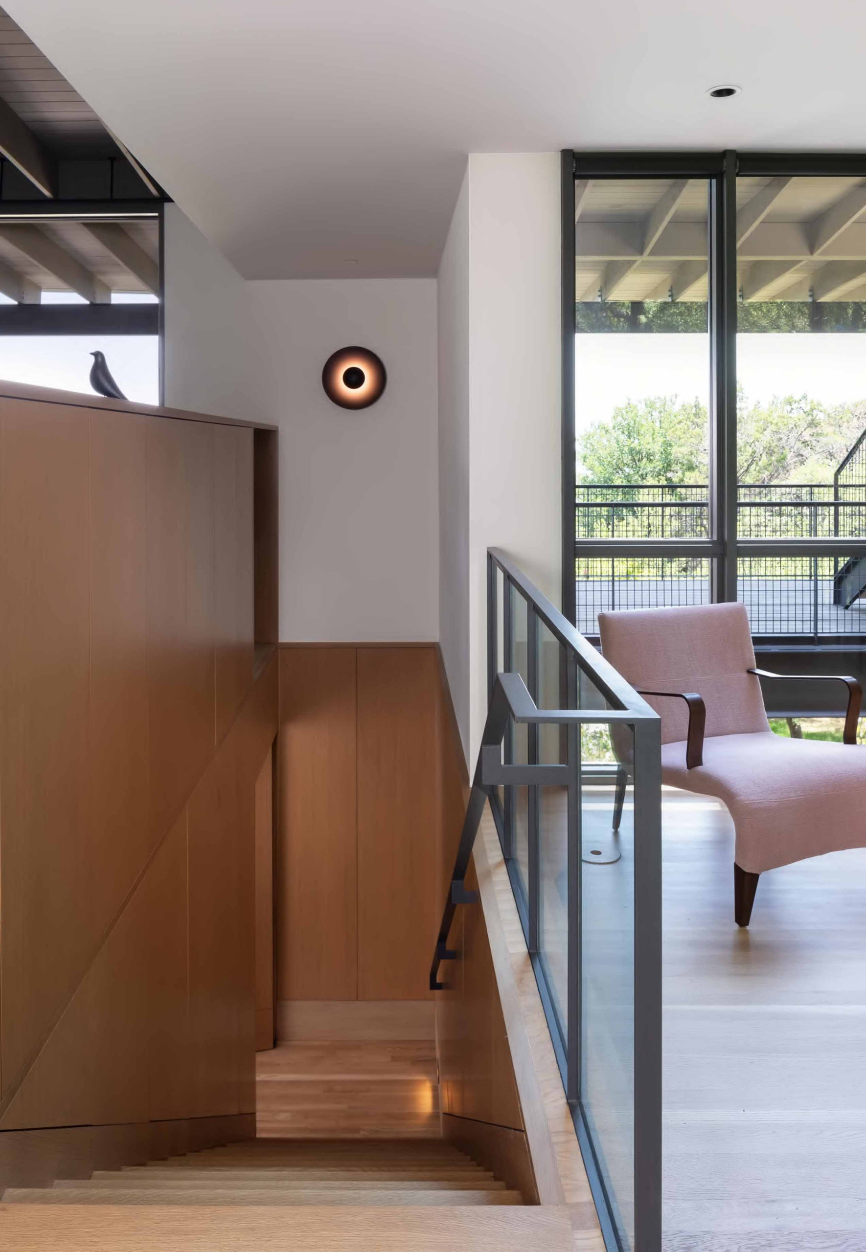 The home’s entry is up the stairs that lead to a glass “bridge,” which contains floor-to-ceiling windows in the dining room, seen at the right of this photo. A breezeway can be seen to the right of the stairs at ground level. “The open breezeway allows cool air from the valley to pass up and through the porch,” Cuppett says. The builders constructed the home with wood siding that will weather naturally, along with blond Texas brick, a palette that will allow the house to quietly recede into the woodlands as it ages, Cuppett says.