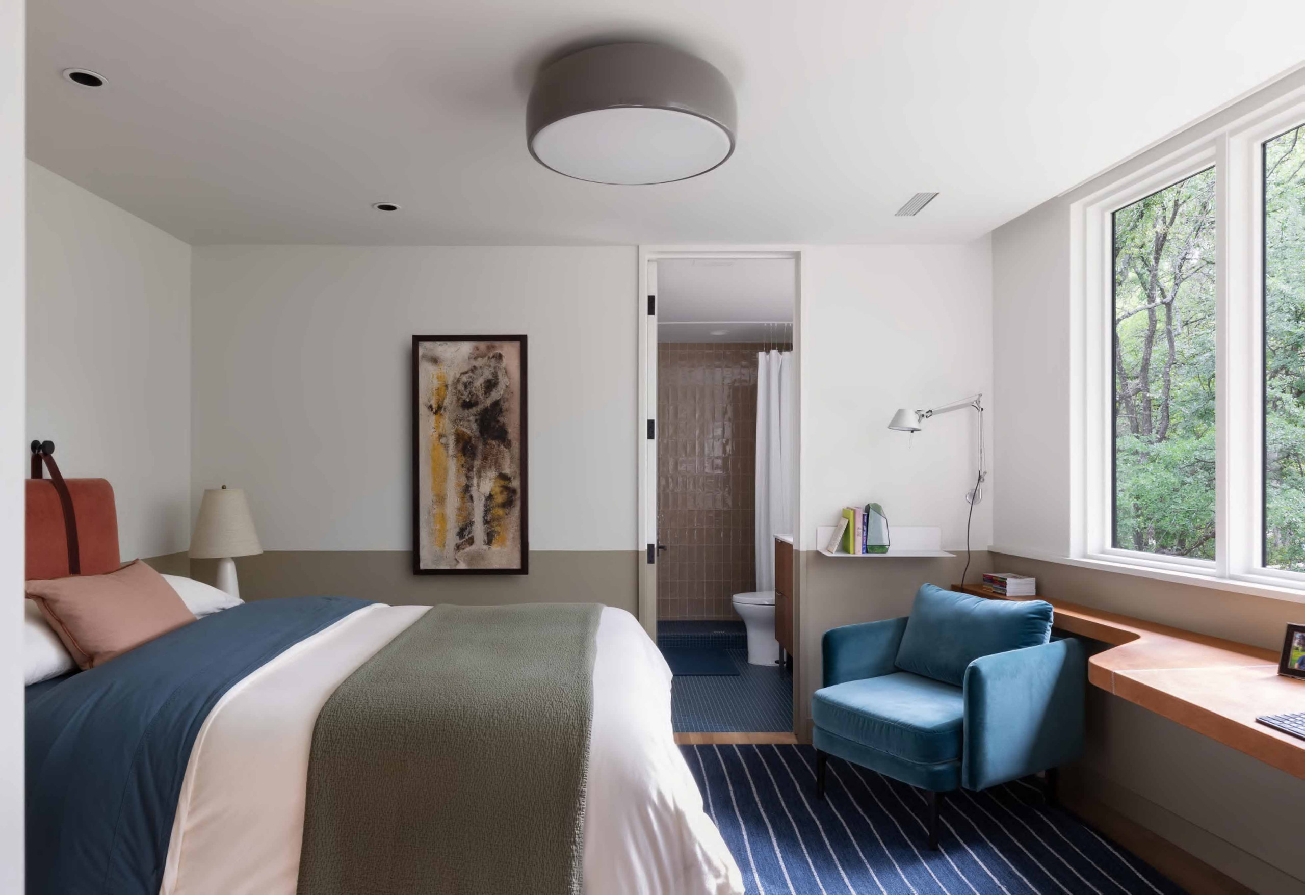 The child’s room has an en suite bath and woodsy views through large windows. A built-in counter runs under the windows for the option of a workspace.