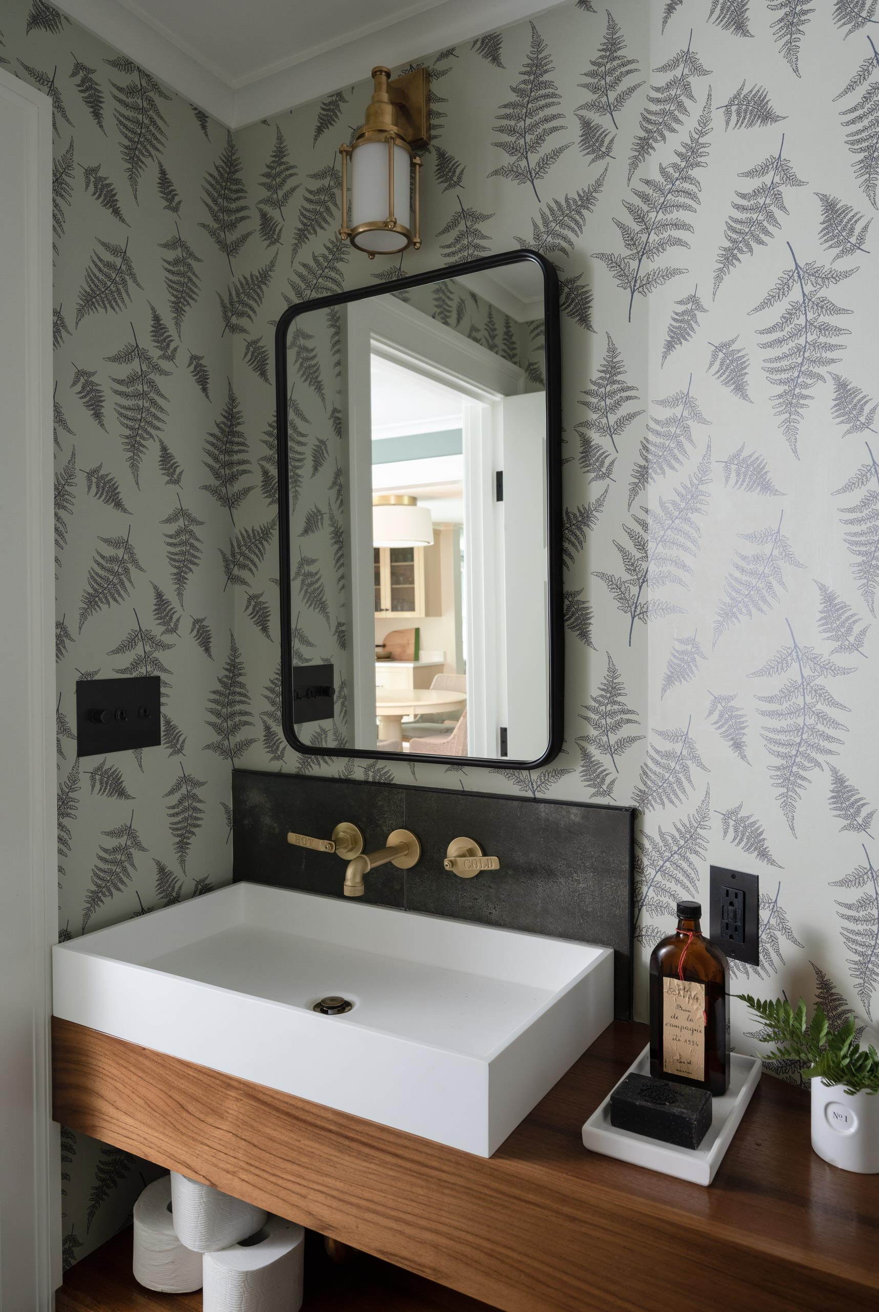 The builder custom-made the vanity from teak. There’s a shelf below the counter to stash things like extra rolls of toilet paper. The backsplash is a large-format slate tile that matches the flooring in the adjacent mudroom. Parkinson had it edged in black metal Schluter strips. Brass finishes and a fern wallpaper elevate the look.