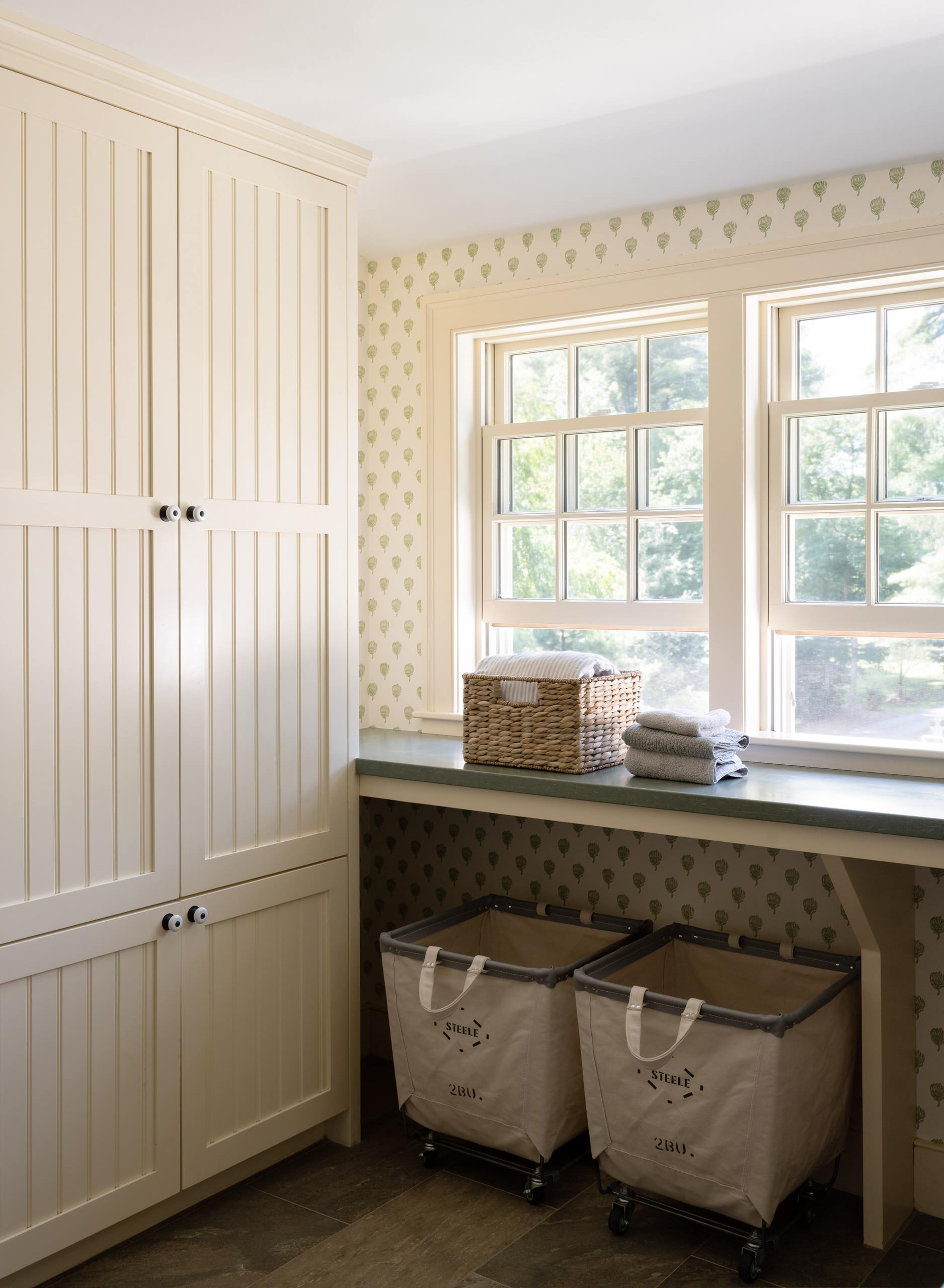 In the laundry room, an artichoke pattern wallpaper, green countertops and beadboard lend the English country look.