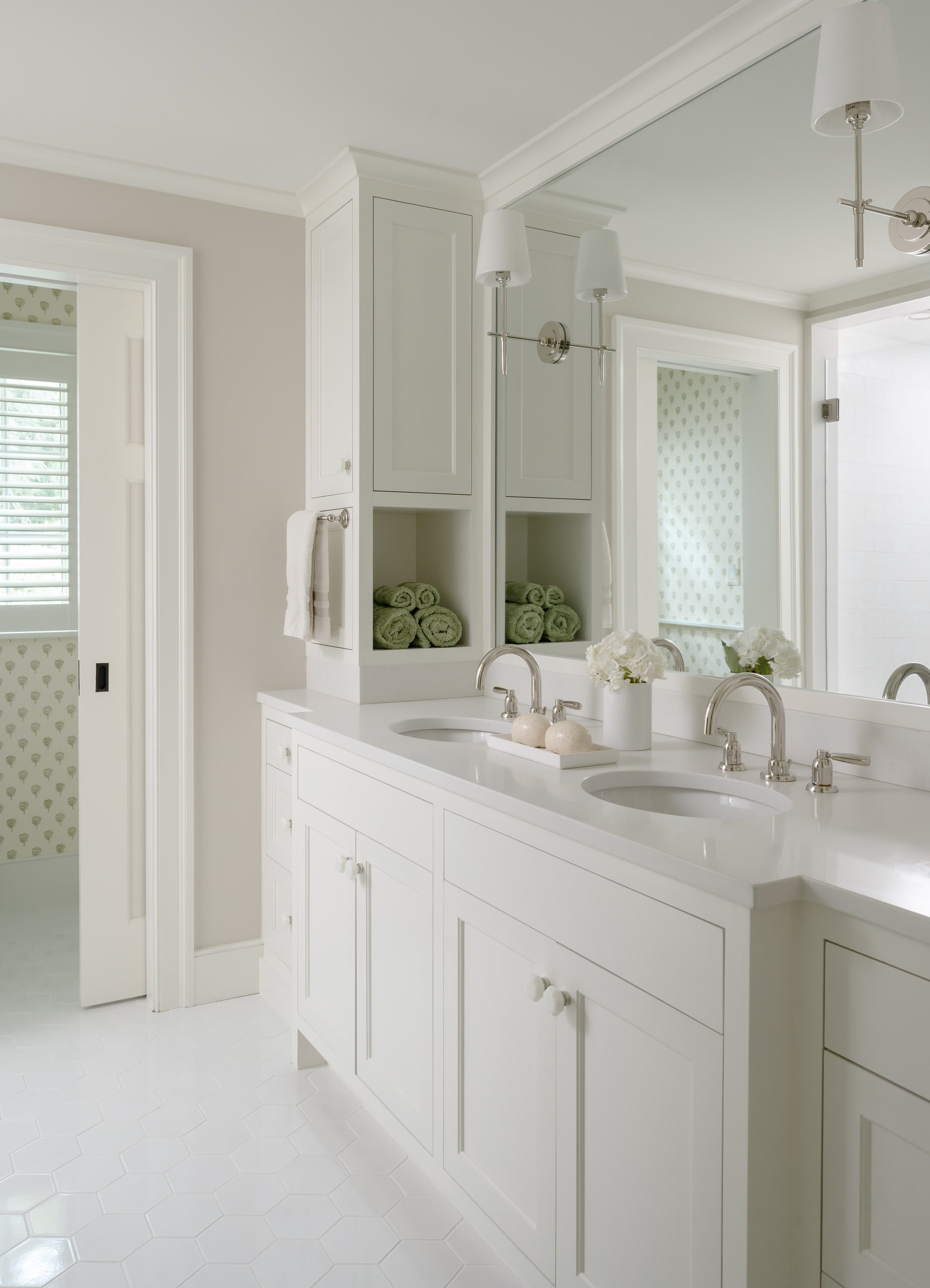 “The architect designed the cabinets and mirror,” Parkinson says. “I helped them with finishes like the lighting, colors, wallpaper and tile.”