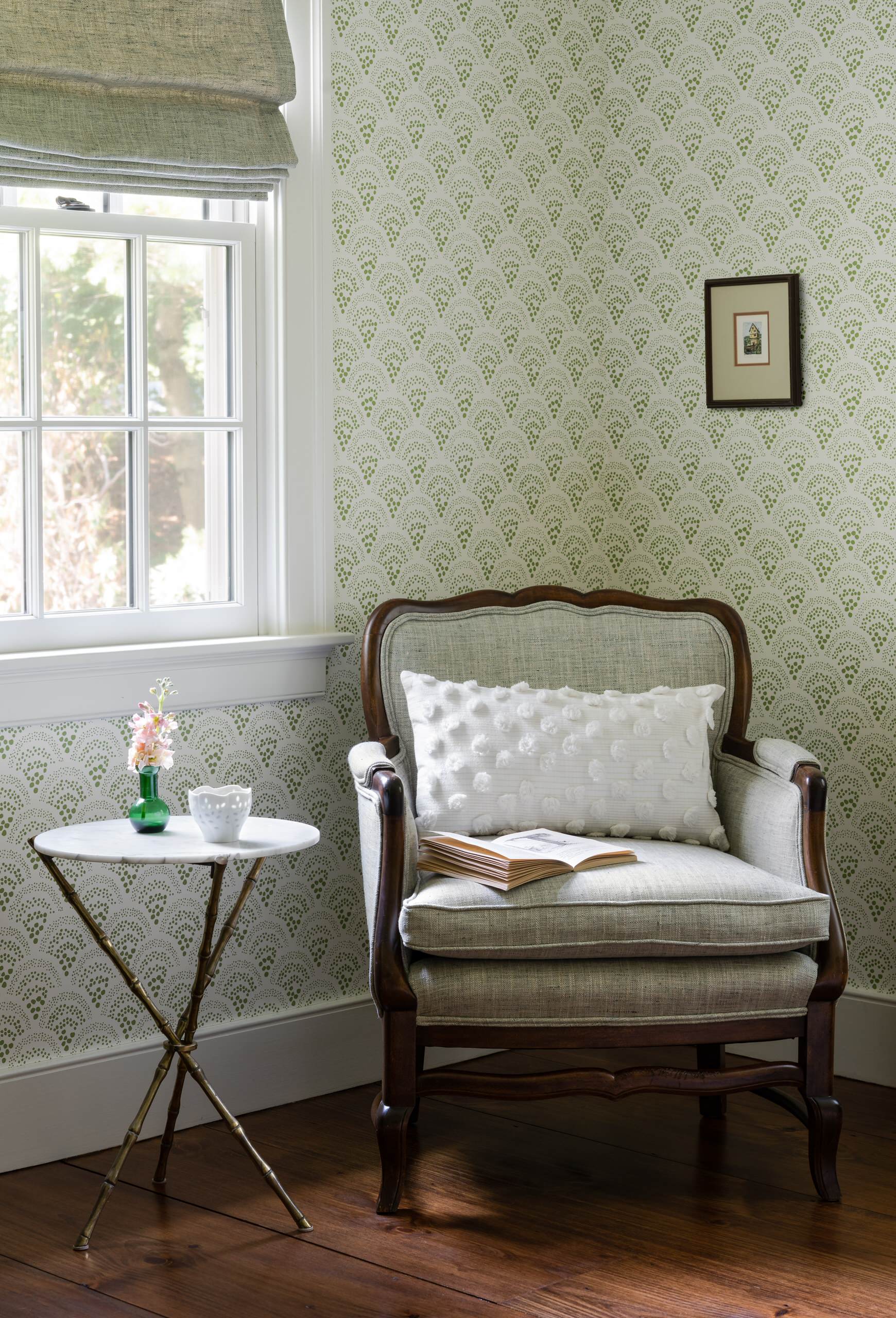 Opposite the French doors is this nook. Parkinson made it special with a beautiful wallpaper. “I had this chair my client already had reupholstered to turn this into a reading nook,” she says.