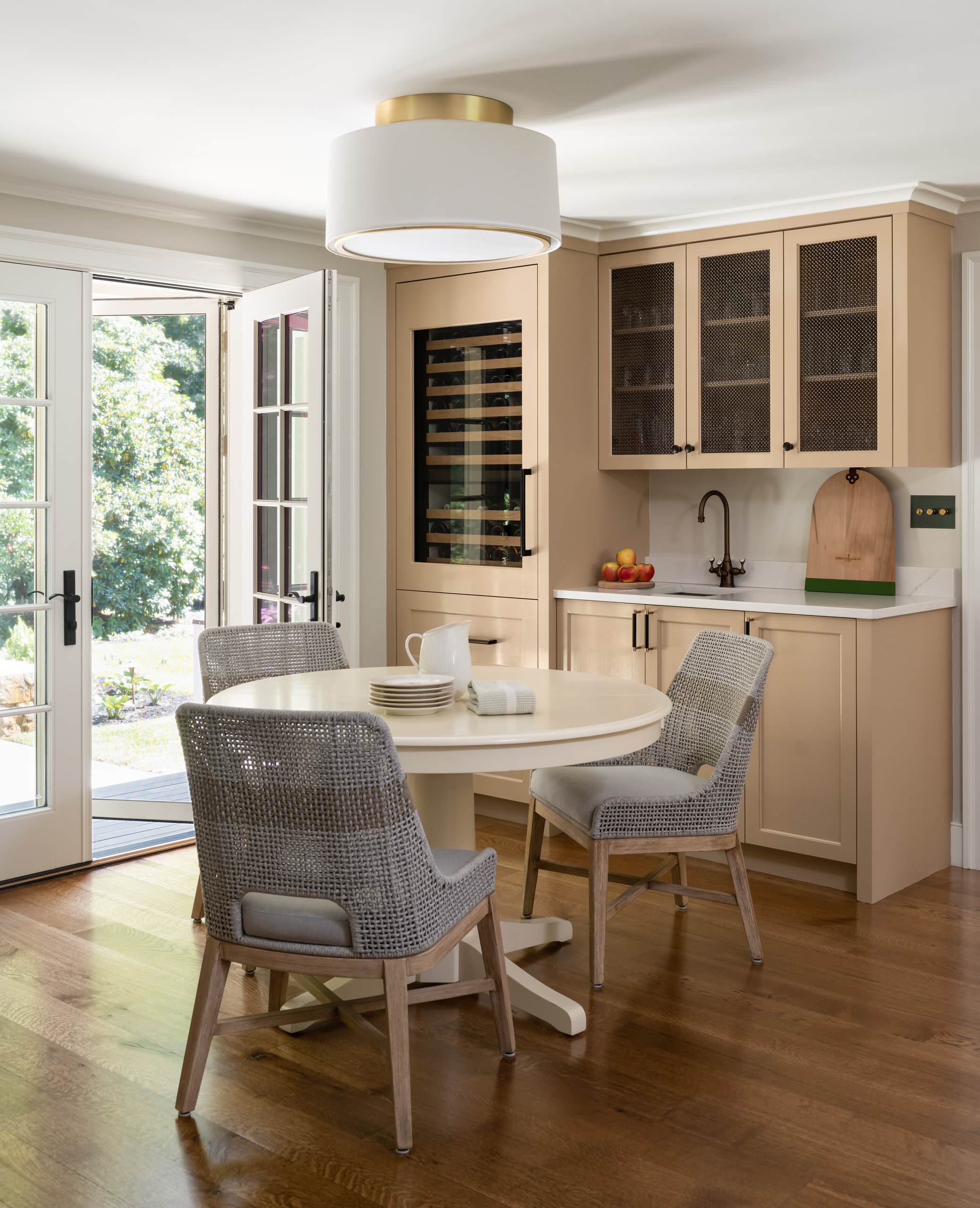Just off the living room is the breakfast and bar area. “Szalaji had already completed the kitchen layout. My role was finding the lighting, the furniture, the hardware and the cabinet paint color,” Parkinson says.