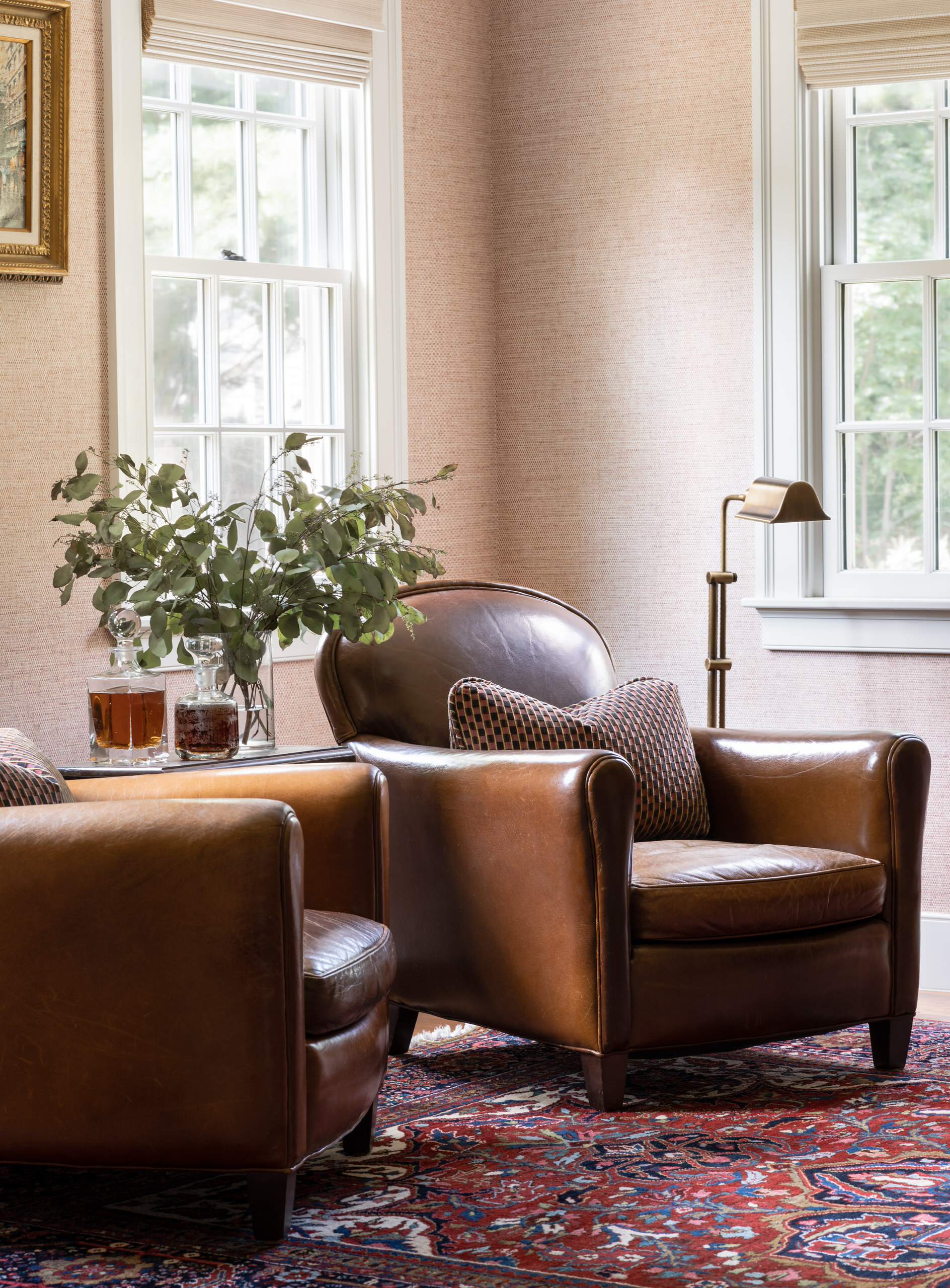 Across the entry space is the library, which the wife uses as her home office. She already had the rug and leather club chairs, so Parkinson selected a grasscloth wallcovering in a warm tone that complemented both. Across from this sitting area is a desk and bookshelves.