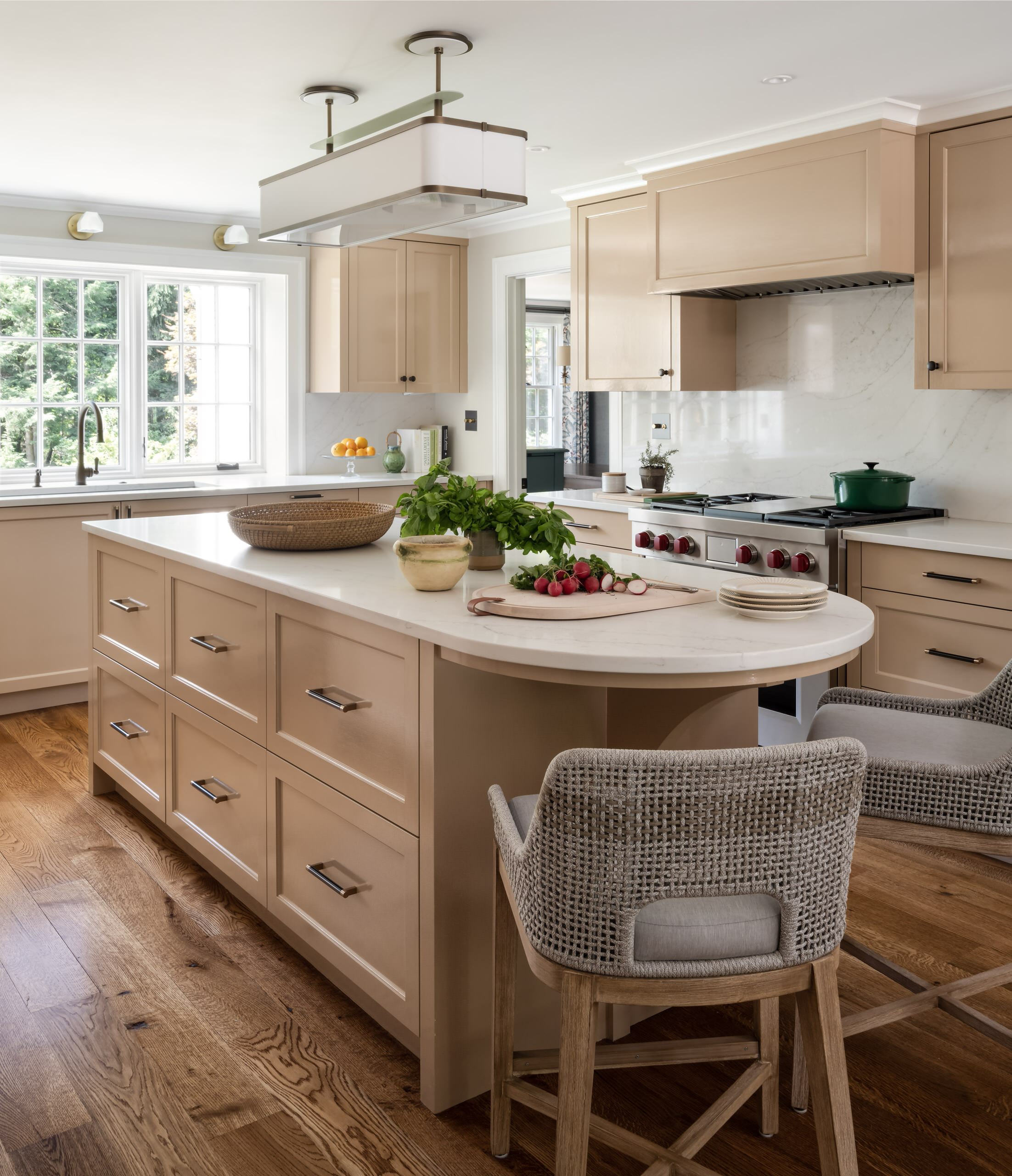 The cabinet paint is a warm tone, Brookline Beige by Benjamin Moore. The countertops are white quartz.