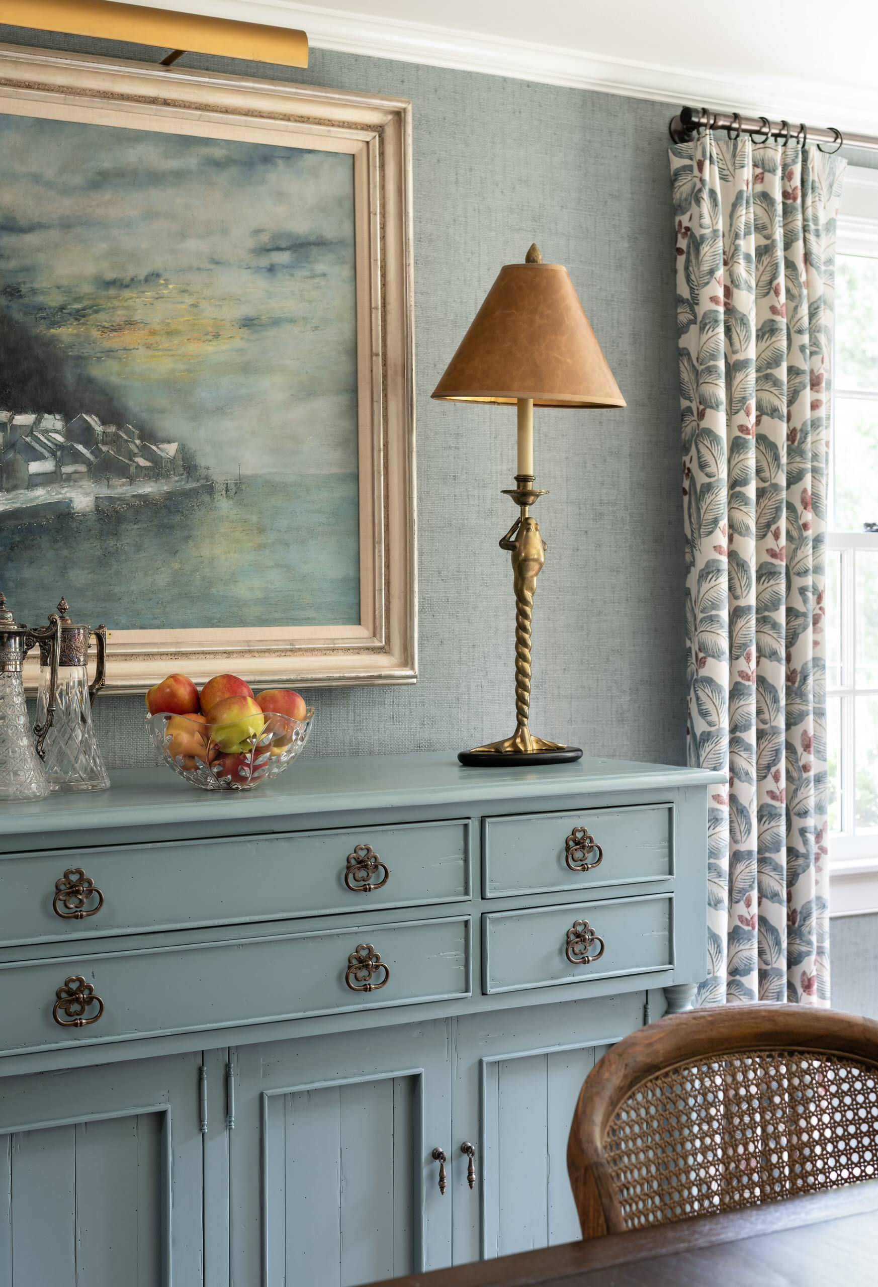 A good example of this is how Parkinson repurposed the homeowners’ existing heavy wood sideboard. “Once we had the color palette down, we had it painted to freshen it up,” she says. She chose a color that played off the grasscloth wallpaper. She also added the homeowners’ frog lamps and artwork to finish off this area.