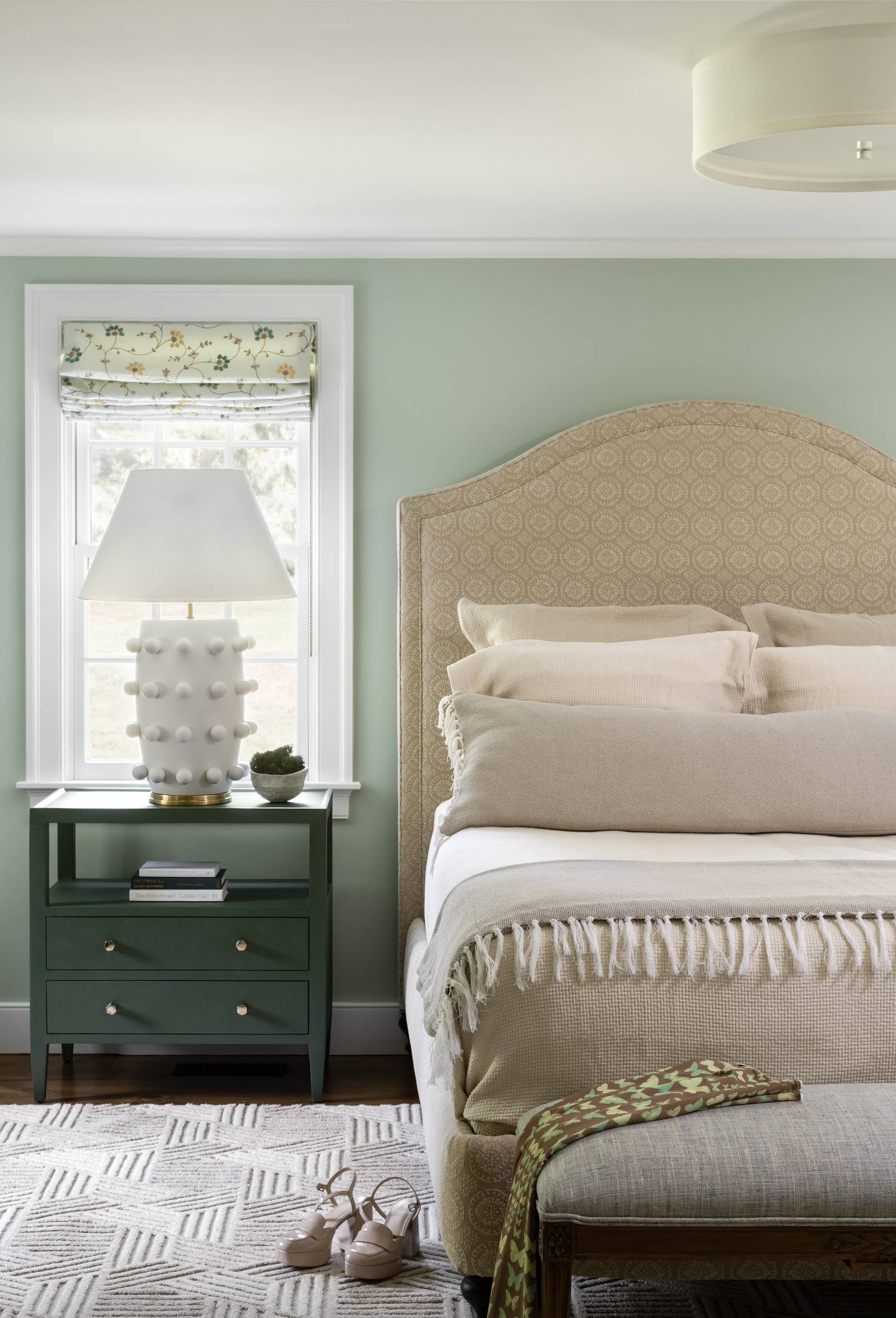 The house has five bedrooms, and the homeowners decided to make this first-floor primary suite the guest suite. Parkinson repurposed drapes from her clients’ former home to fit in the space, including cutting some of the fabric into the Roman shades that flank the bed. She chose a spring green paint for the walls that plays off the fabric. The linen-wrapped green dresser is new.