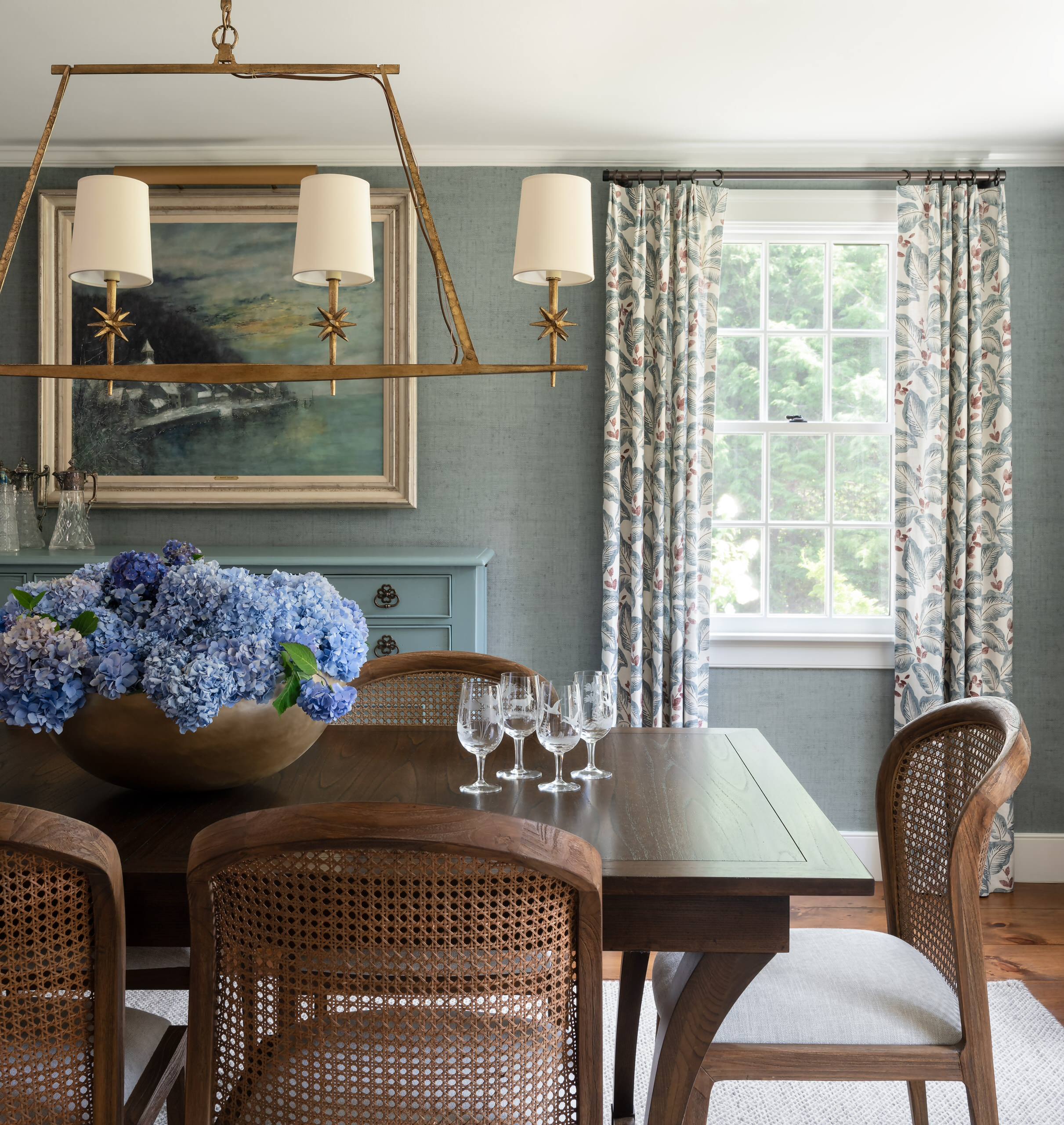 In the dining room, the wood and painted finishes, grasscloth wallpaper, caned chairs and floral drapery fabric nod to English country style.